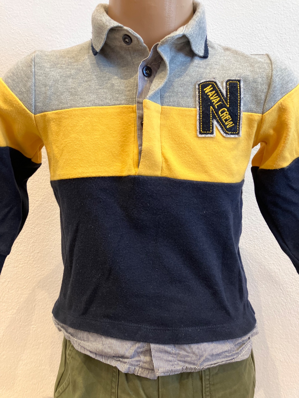 Chlapčenská polokošeľa s dlhým rukávom, zapínanie na tri gombíky, elastická, materiál 100% bavlna. Farba sivo-žlto-tmavomodrá.