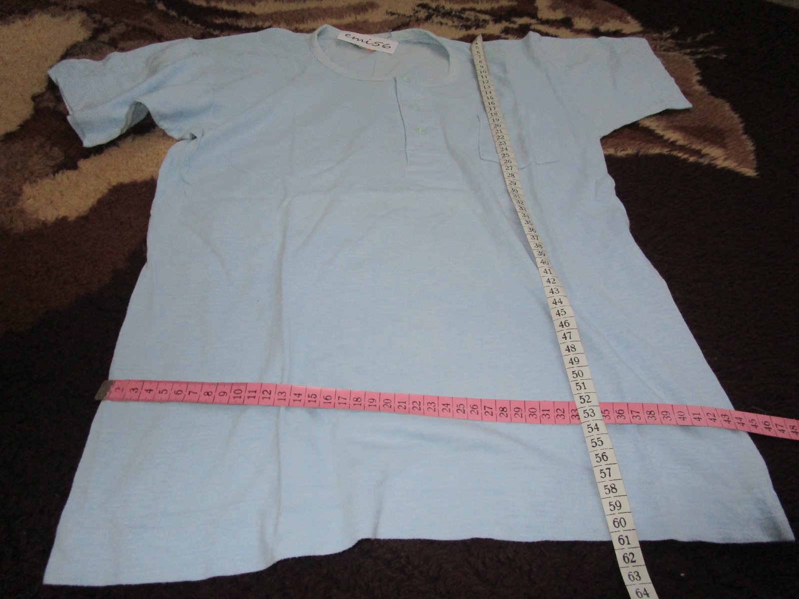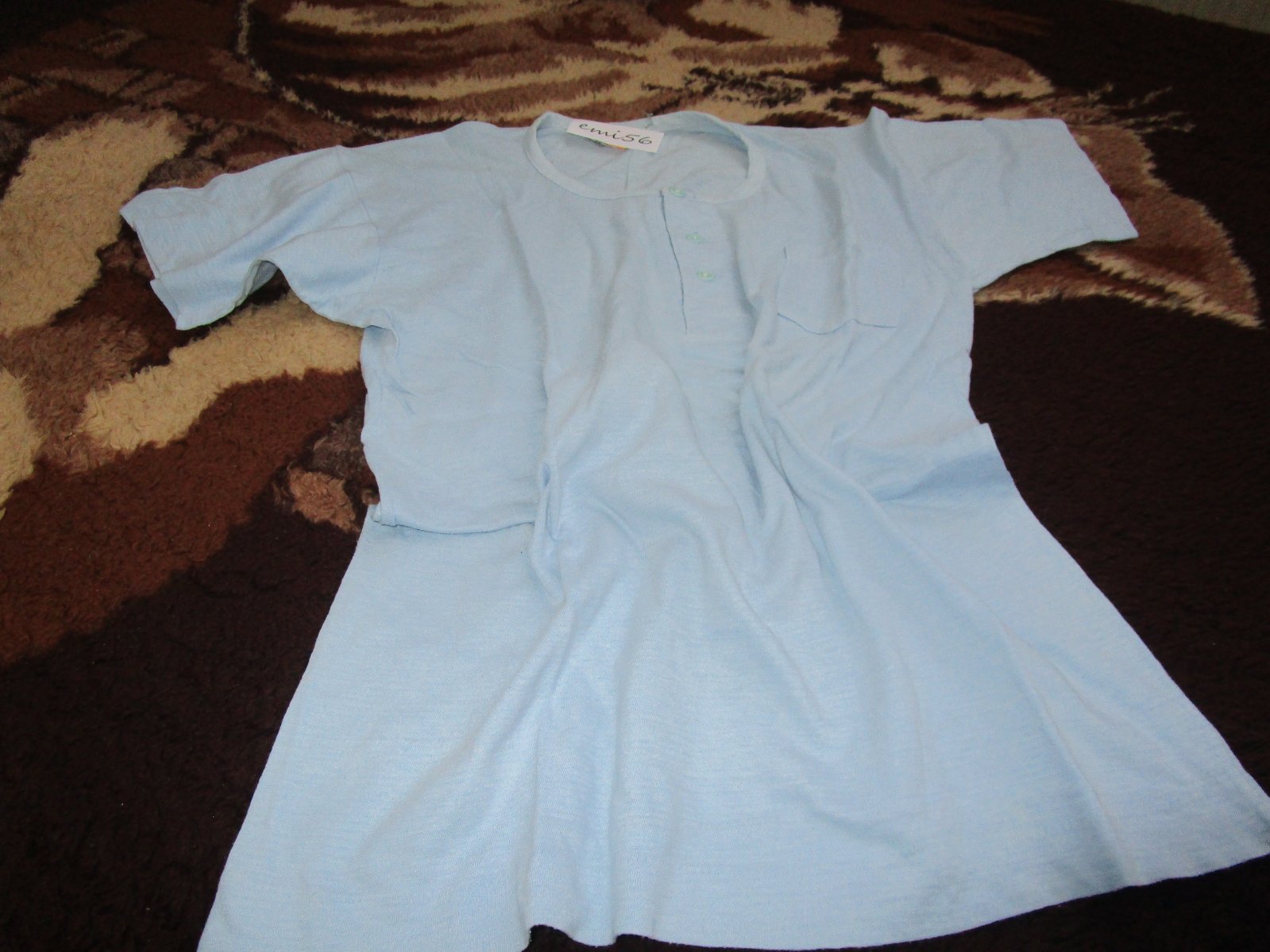Modré tričko – okrúhly výstrih, rovný dolný okraj, rukávy krátke. Vpredu je1 vrecko, Zapínanie na 3 gombíky.