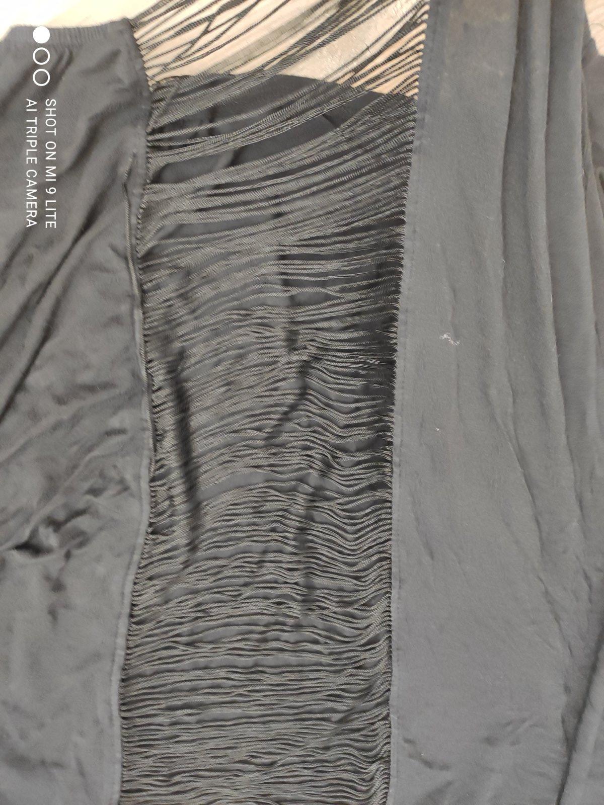 velmi zaujimave cierne elasticke ticko volnejsieho strihu so zaujimavou zadnou castou - v strede chrbta je efektna priehladna cast. neviem upresnit velkost nakolko na vrchnom stitku je S/M a na vnutornej visacke je L/XL , jedna sa o velkost UNI, sadne aj na mensie velkosti aj vacsie.