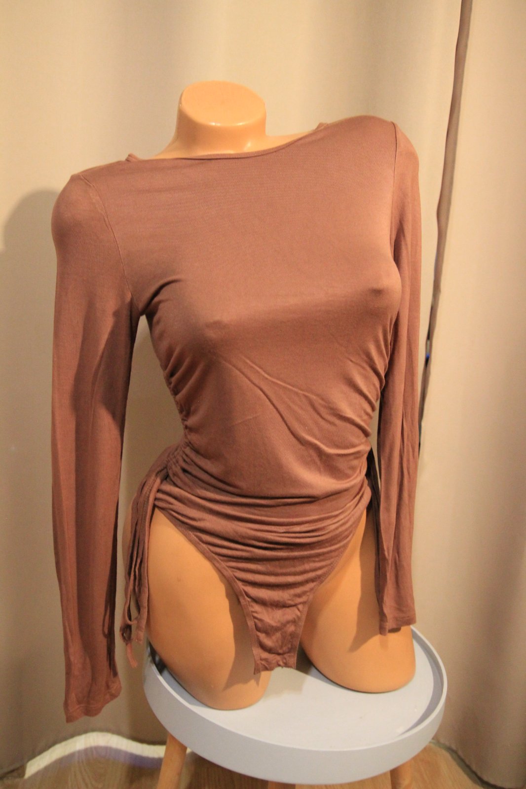 Hnedé elastické body tričko s dlhými rukávmi, veľkosť S, Po bokoch zberané. Elastický materiál.