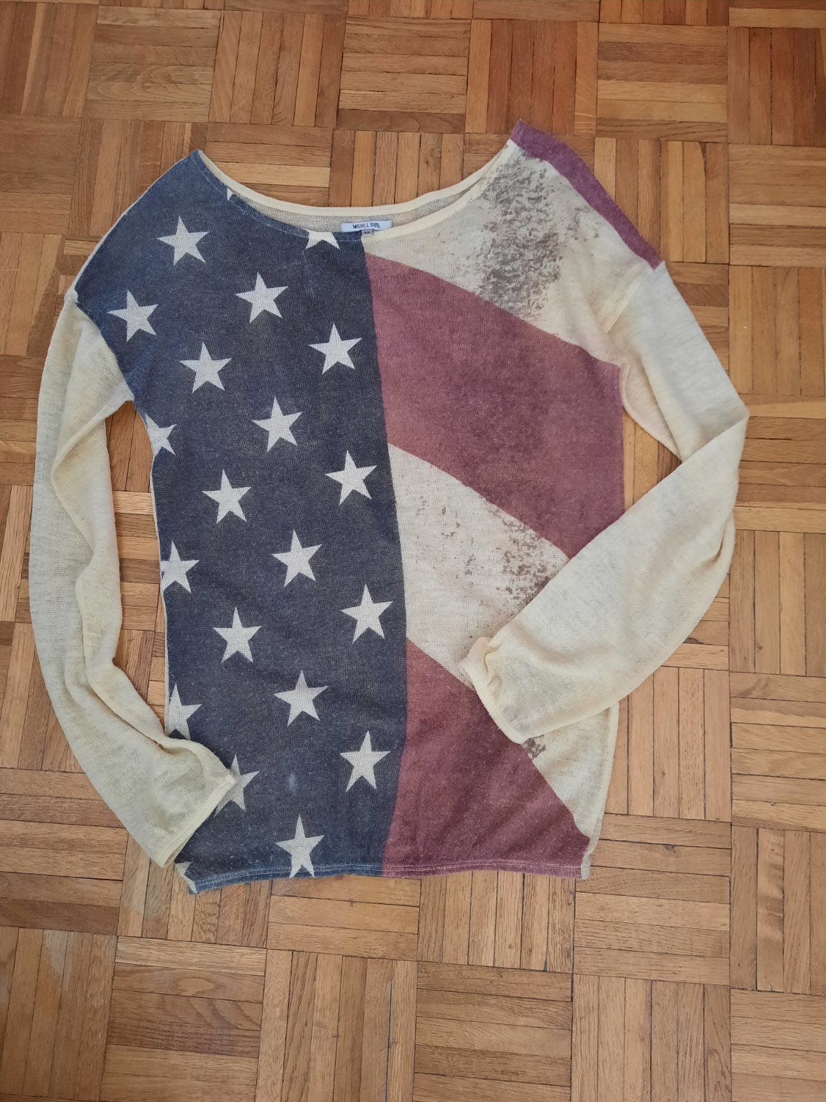 Predám tričko /pulóvrik tenší vo výbornom stave. Rukávy aj spodok je ukončený tenkou gumou. Výstrih je lodičkový. Materiál je príjemný na dotyk, trošičku priesvitný.