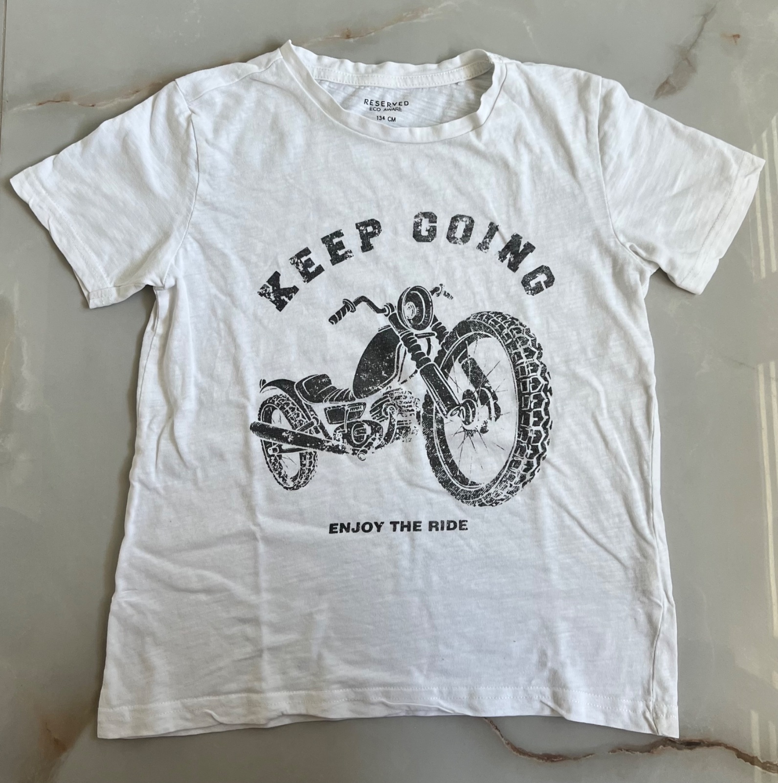 Nosené, prvé tričko má zašitú malú dierku na boku, ostatné bez poškodenia. Veľkosť na tričkách udaná 140, reálne sme nosili ako 134. V pravo tričká predané.