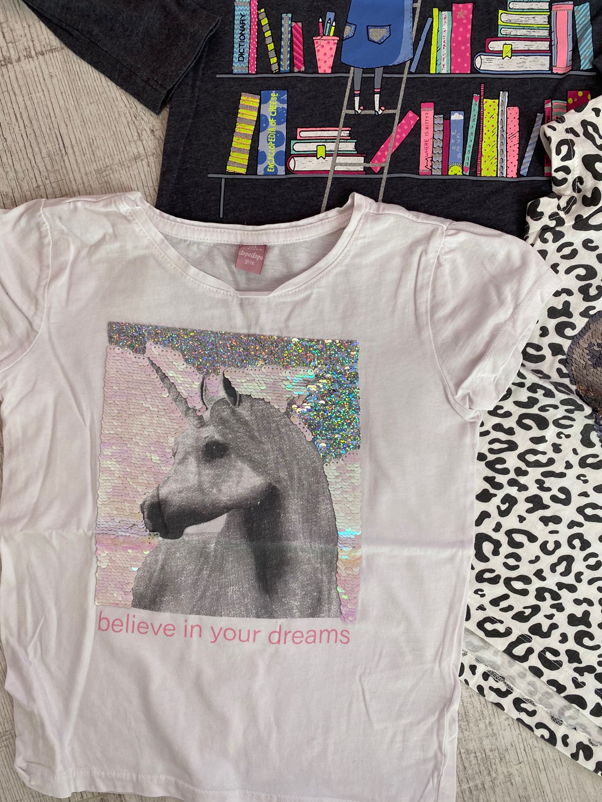 Mix tričiek vo veľkosti 122/128, leopardie nové , šedé nové , tričko s miskou nové , leopardie krátky rukáv nové biele s konikom nosene bez poškodenia .
