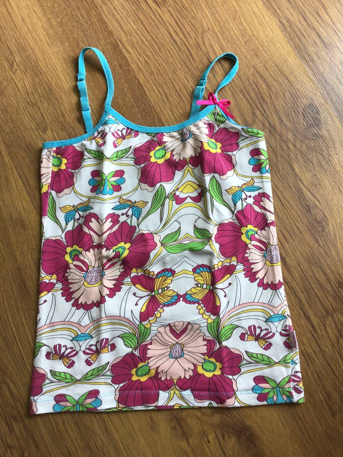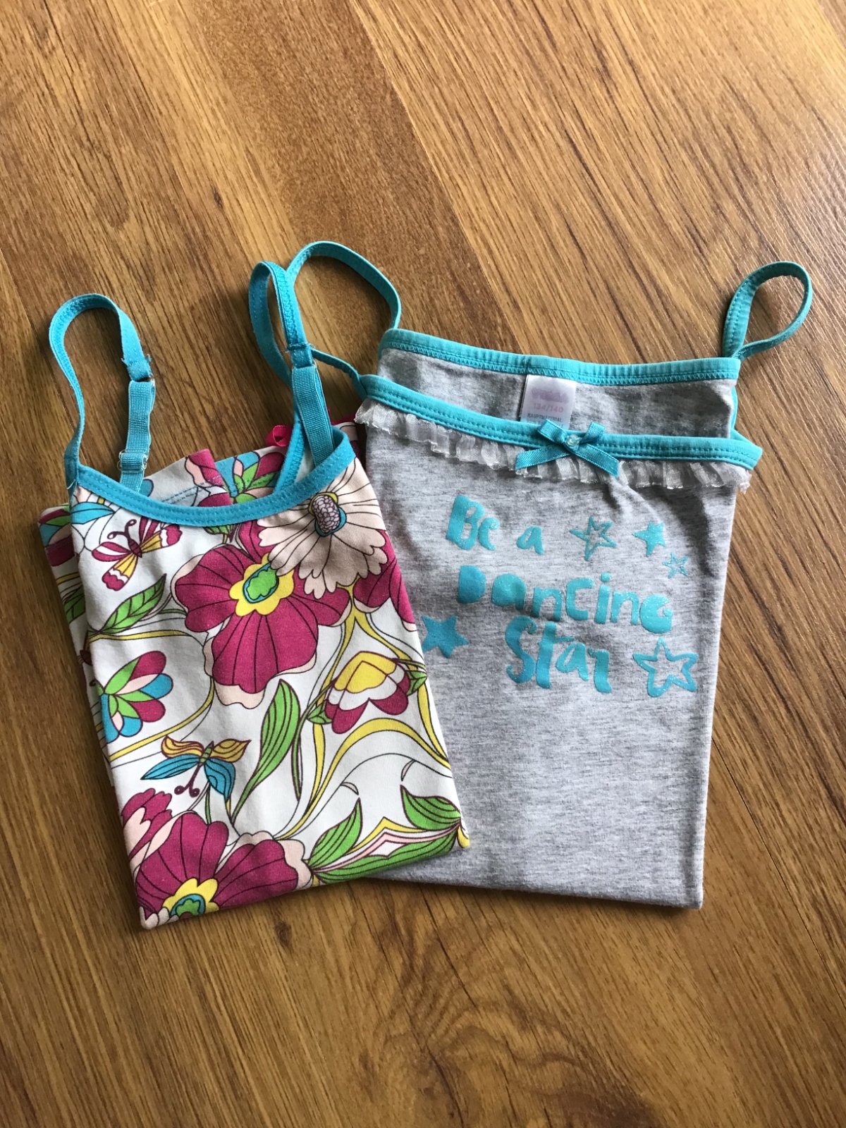 1. Farebne s kvetmi, mierne znamky prania na farbach a gumickovych ramienkach. Inac bez poskodeni. ( sirka 29cm, dlzka 45cm )