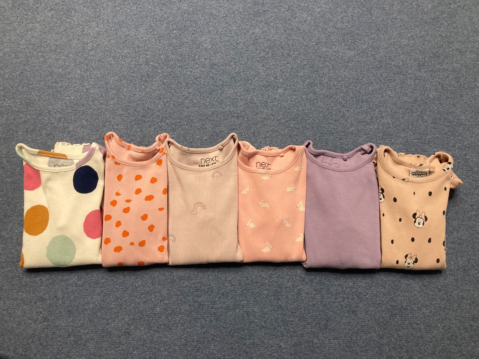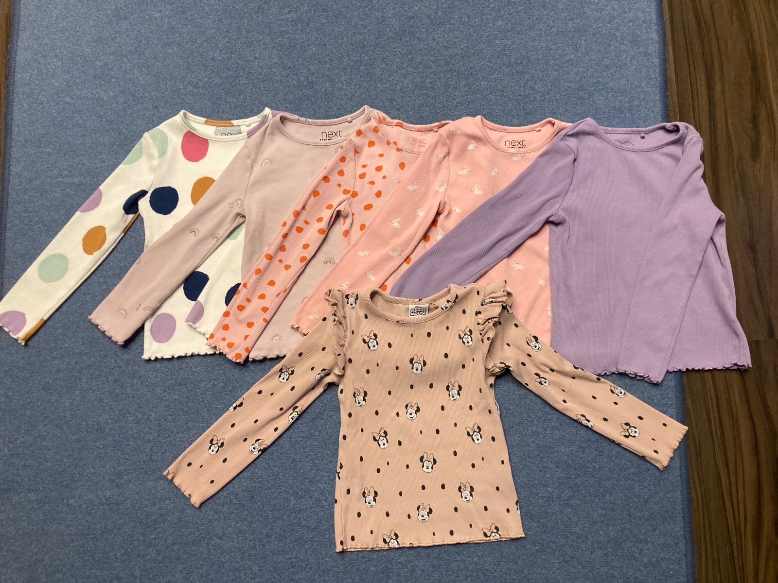 Predávam trička s dlhým rukávom, všetky značky Next, kvalitná bavlna, vrúbkované, našla som asi 2 miniflaky, nedali sa odfotiť. Podľa mna stále vhodné do škôlky.