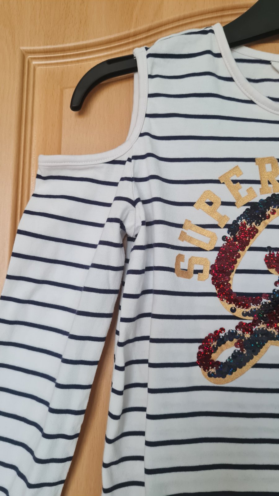Predám krásne tričko SupercGirl veľkosť 152/158. TOP stav - 1x oblečené. Nápis v predu je premieňací v dvoch farbách (červená a modrá). Zaujímavo riešené ramená. Kvalitná 100 % bavlna. Dĺžka 59 cm, šírka 42 cm, rukáv 55 cm.