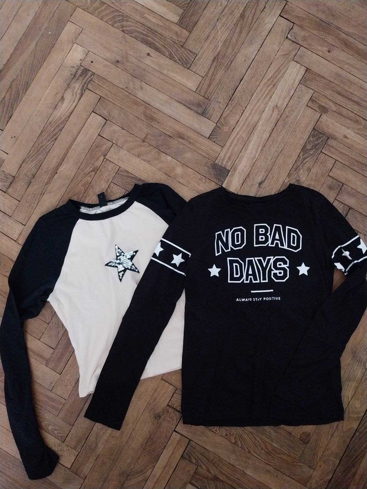 Málo nosené tričká, čierne č 146/152 , dĺžka rukáva od krku 62cm a dĺžka celkom 53cm. Croptopové tričko č 36 , dĺžka rukáva od krku 64 cm a dĺžka celkom 43cm. Cena za ks. 4,50 plus pošta.