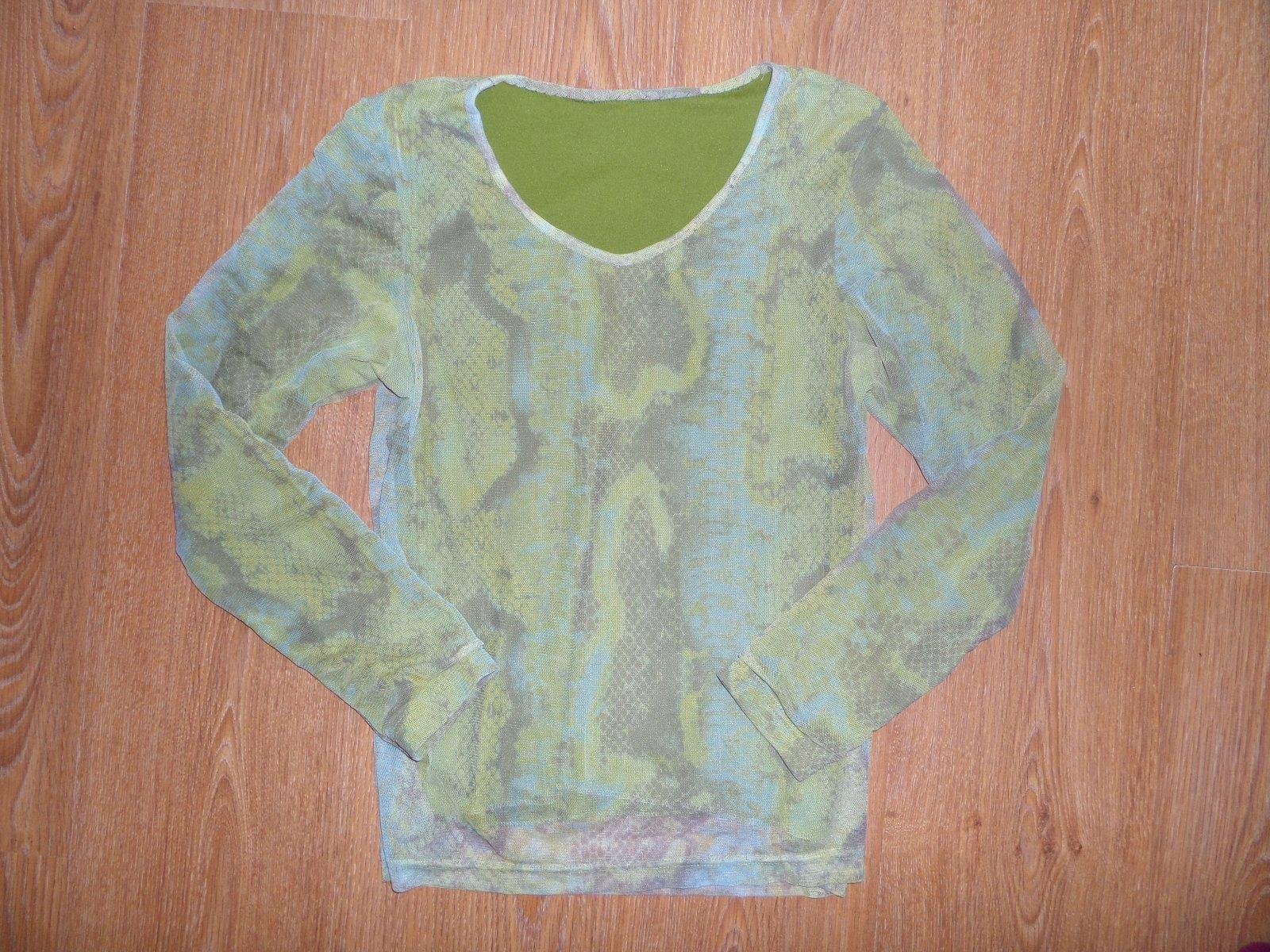 bledej zelenkavej farby s "voda" padajucim vystrihom,pulovrik,mat.hladky,mierne pruzny,tensi,asi polyester. v dobrom nosenom stave. sir.pod ruk. 44-50x2cm sirka 39-47x2cm rukav od pliec 55cm plece ...