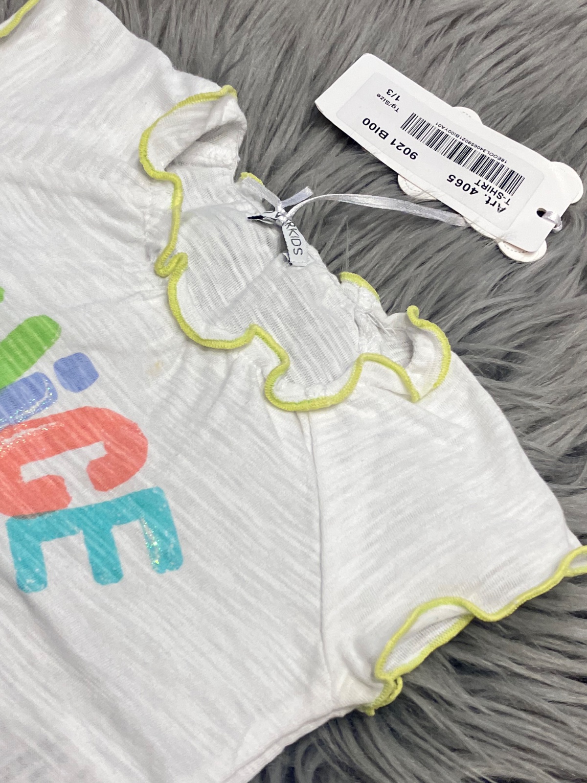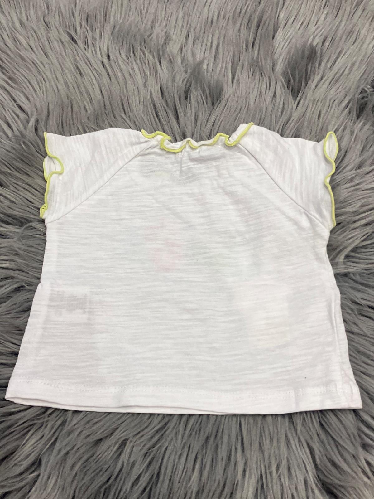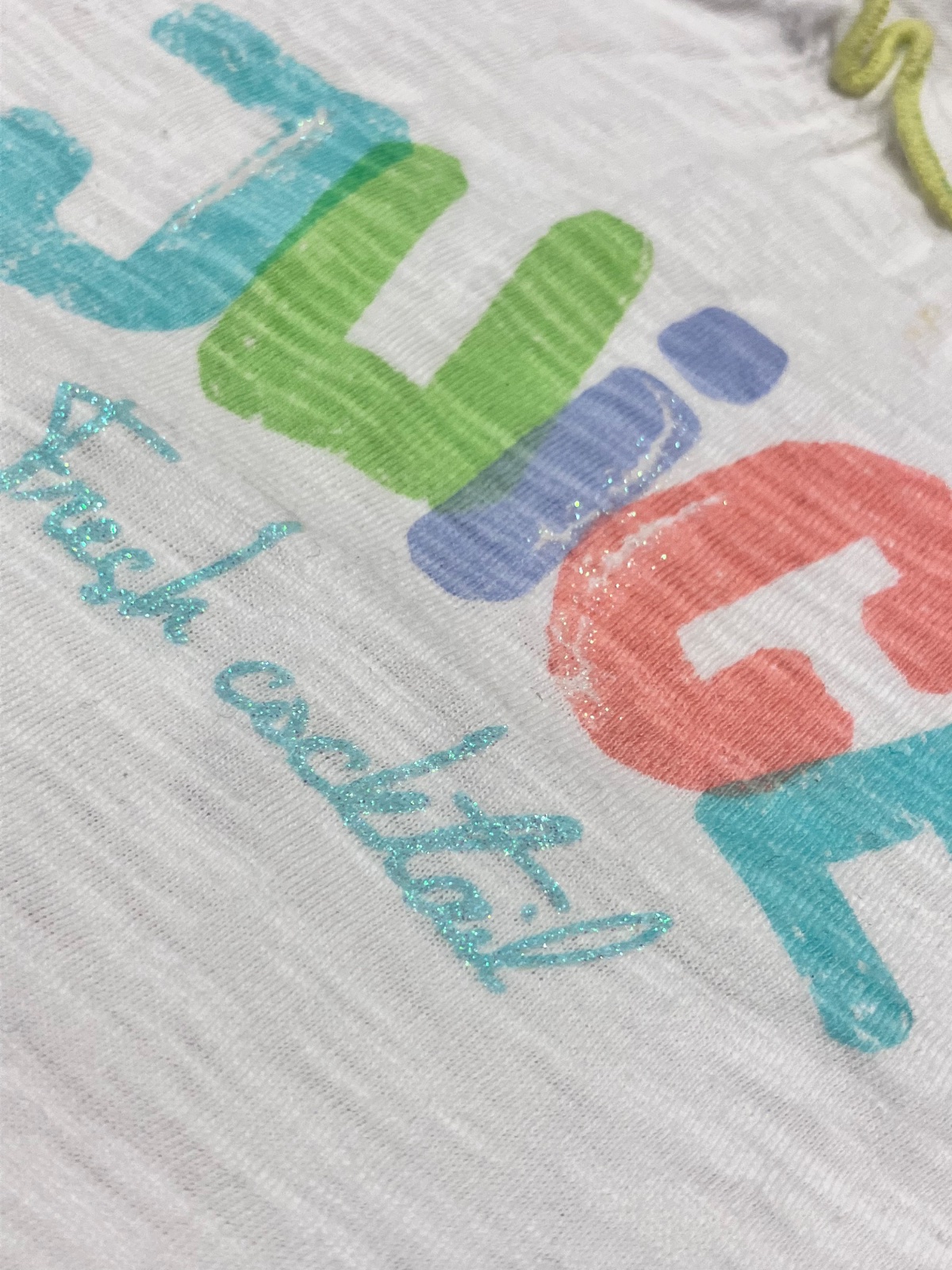 SkladomDievčenské tričko s krátkym rukávom značky Overkids, melírované, s fodričkami na krku a na rukáve. Nápis Juice fresh coctail, niektoré písmená sú lesklé. Pri krku a pri rukáve s jemnou elastickou gumičkou. Elastické. Pre 1-3 mes. Materiál 100%bavlna.