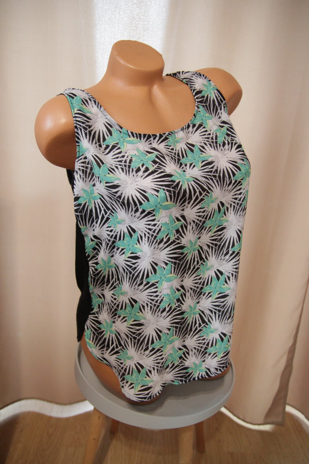Zeleno bielo čierny top s kvetmi, látka vzadu je elastická a je na nej pár žmolkov, veľkosť M.
