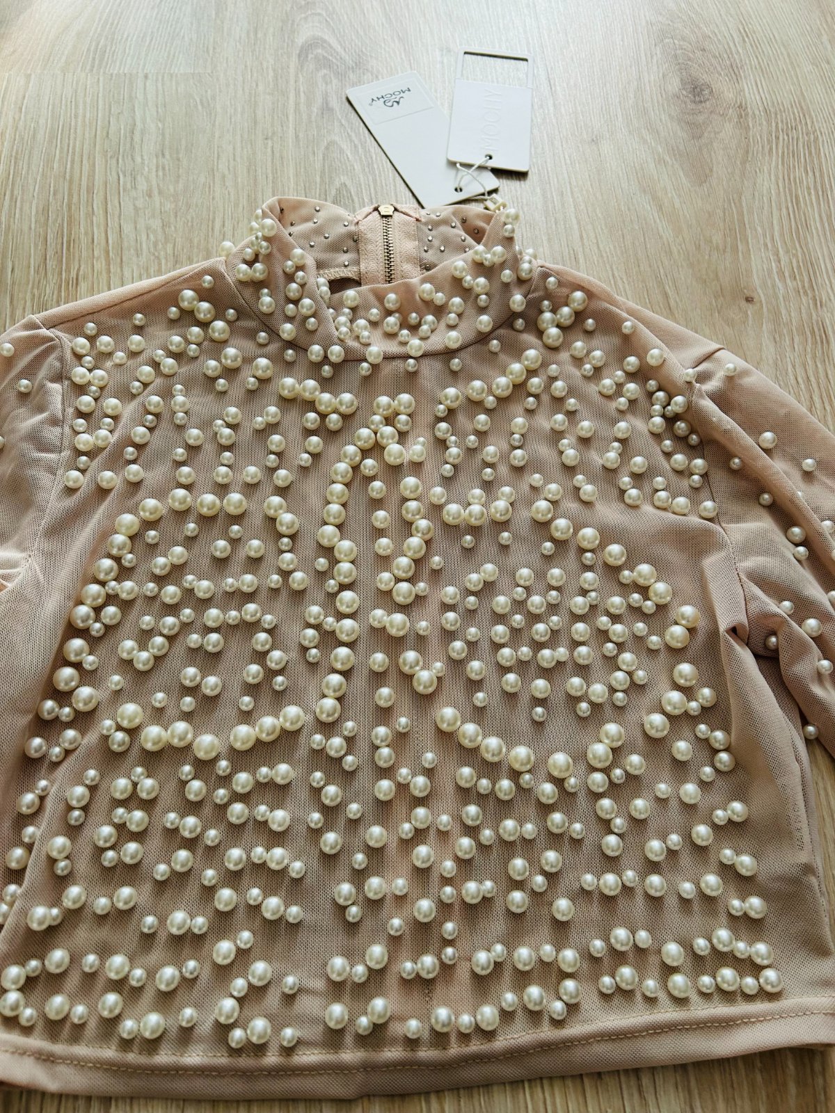 Predám tento nádherný top s perlami značky GREENAPPLE v dvojveľkosti S/M. Pôvodne stál 36 EUR. Je to priesvitný top s bohatým zdobením perličkami. Zapína sa vzadu na zips.
