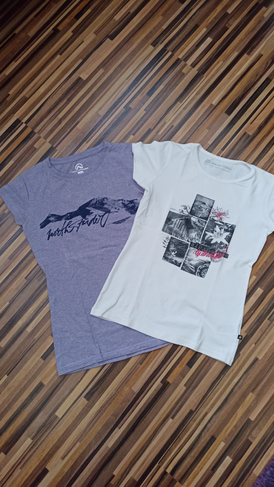 Biele tričko Alpine pro, Fialkové north finder, super stav cena za obe spolu