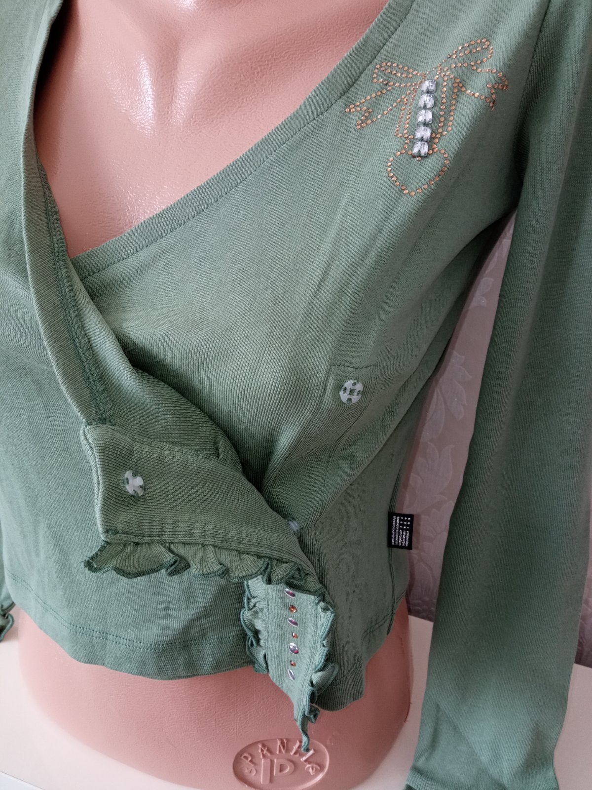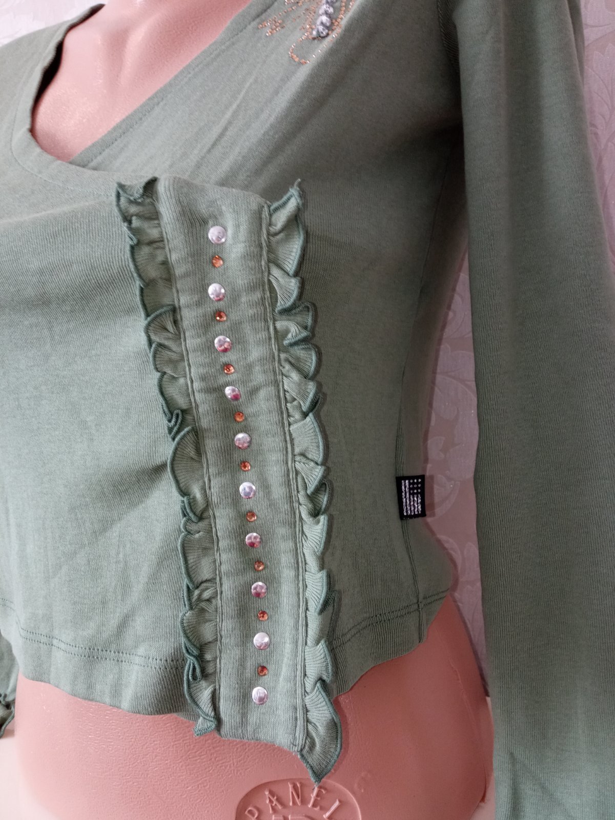 Dievčenské krátke tričko s dlhým rukávom a volánom značky Original Marines, tenké, véčkový výstrih, elastické, vianočný motív s kamienkami, zapínanie na patent. Farba: khaki. Materiál 100%bavlna.