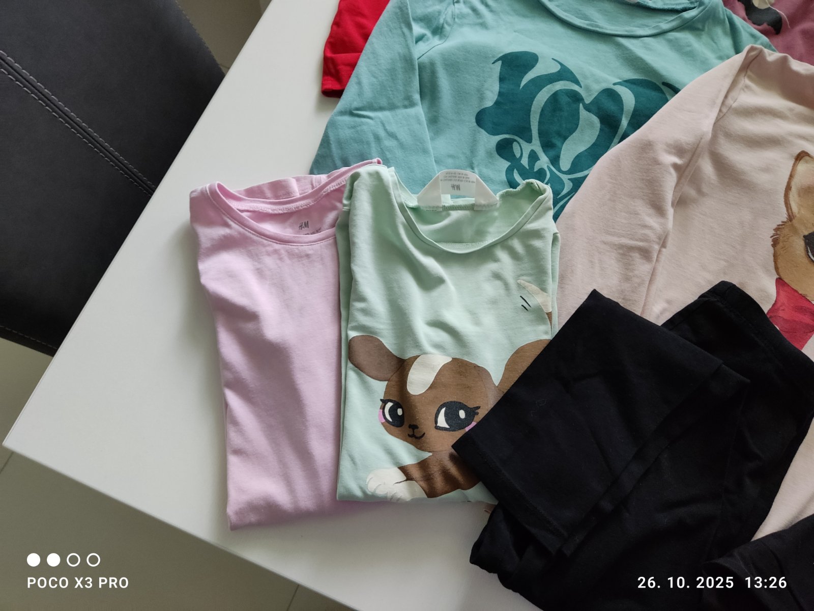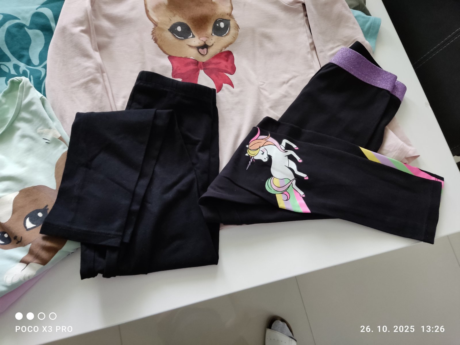 Tričká vo výbornom nosenom stave, dve poskladane k nim darujem, legíny čierne veľkosť 134, jednorozcove 140. Cena a predaj spolu.