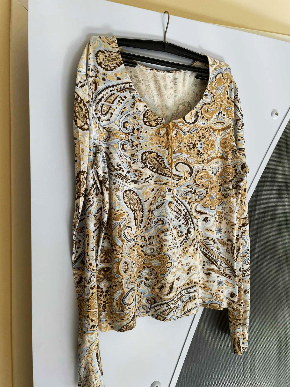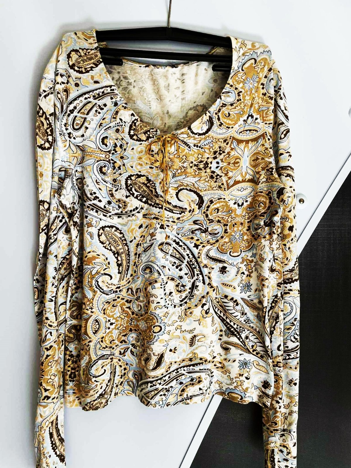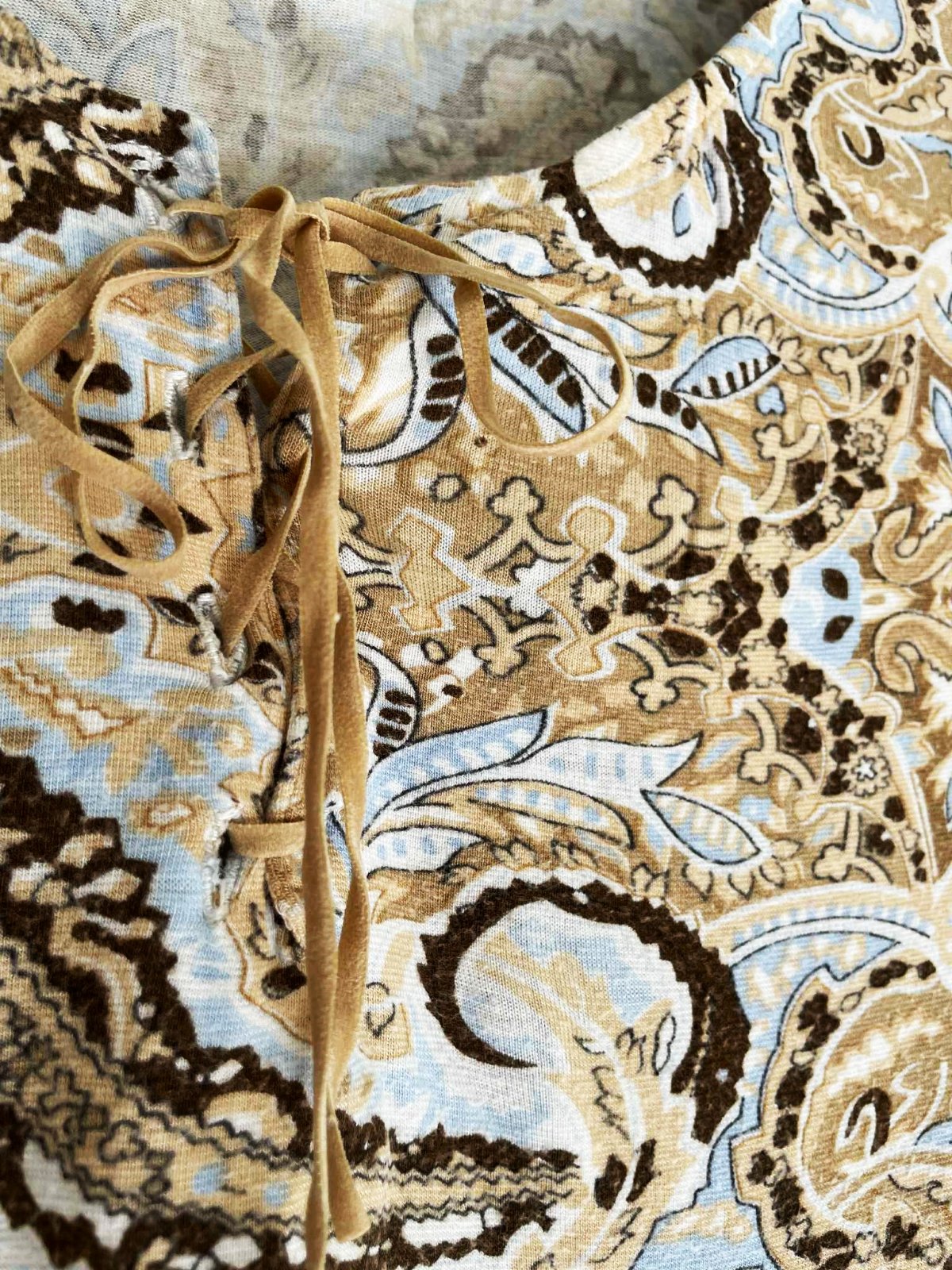 tenšie elastické nevšedné tričko z kvalitného materiálu ,neznosené,v šnurovačke semišová tkanička,dlžka = 65 cm, ramená = 13 cm, rukáv = 66 - 67 cm,šírka meraná pod prsiami = 48 x 2 cm