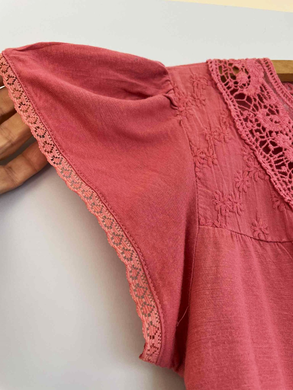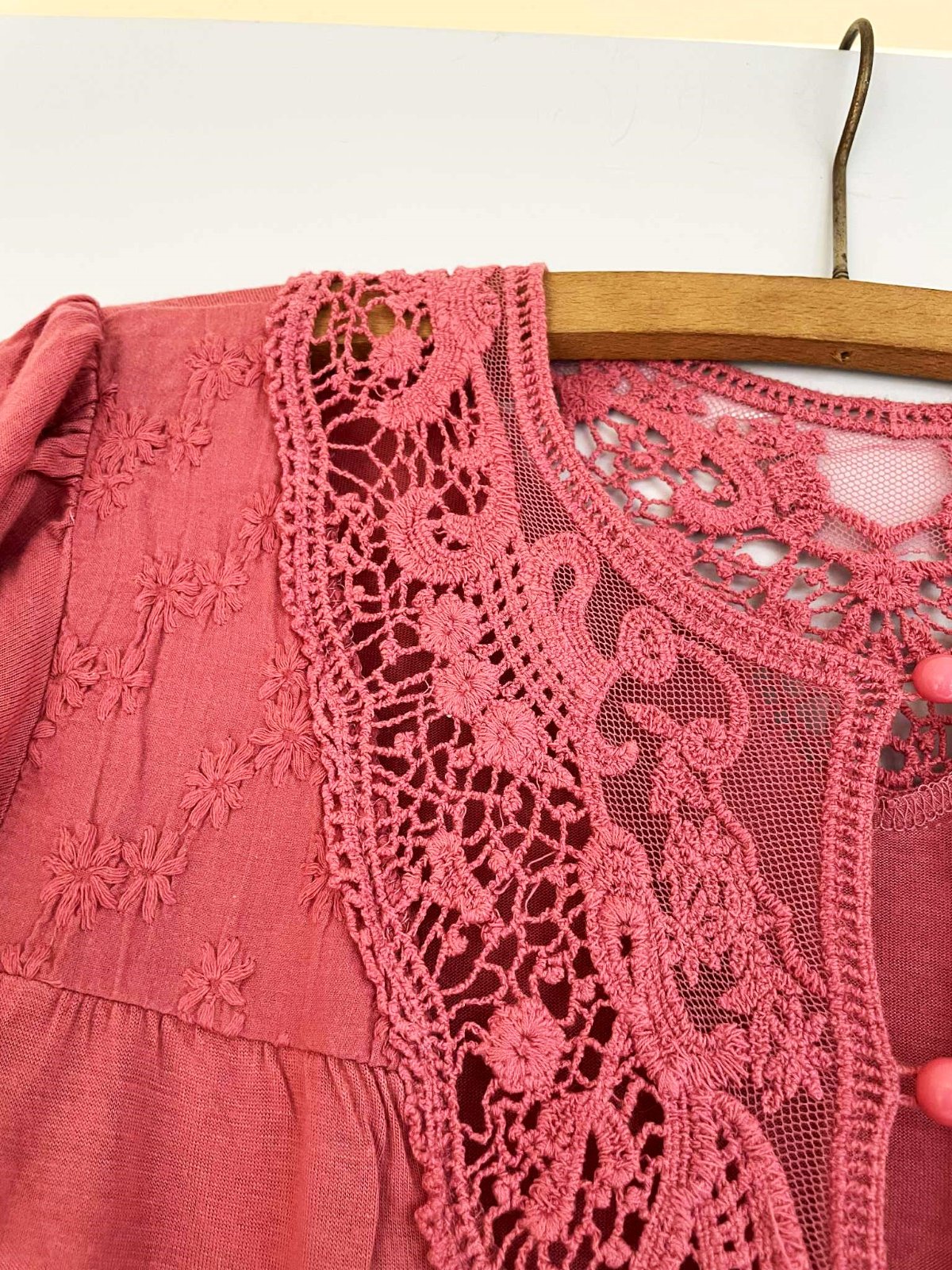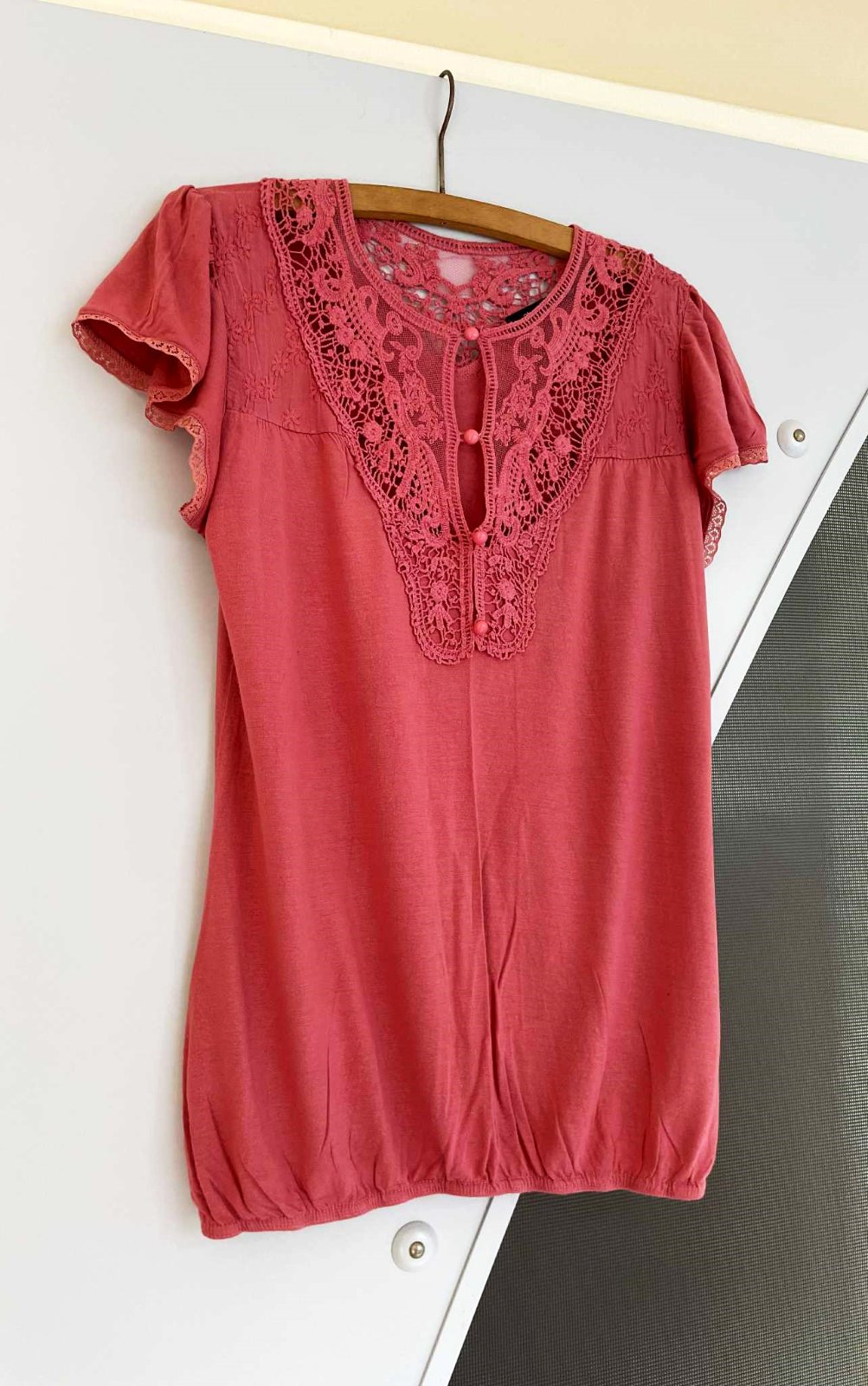 nádherné romantické tričko,neznosené, farba matná - vyblednutá nevýrazná malinovo ružová,top stav a kvalita,veľkoť a značka vyfotené