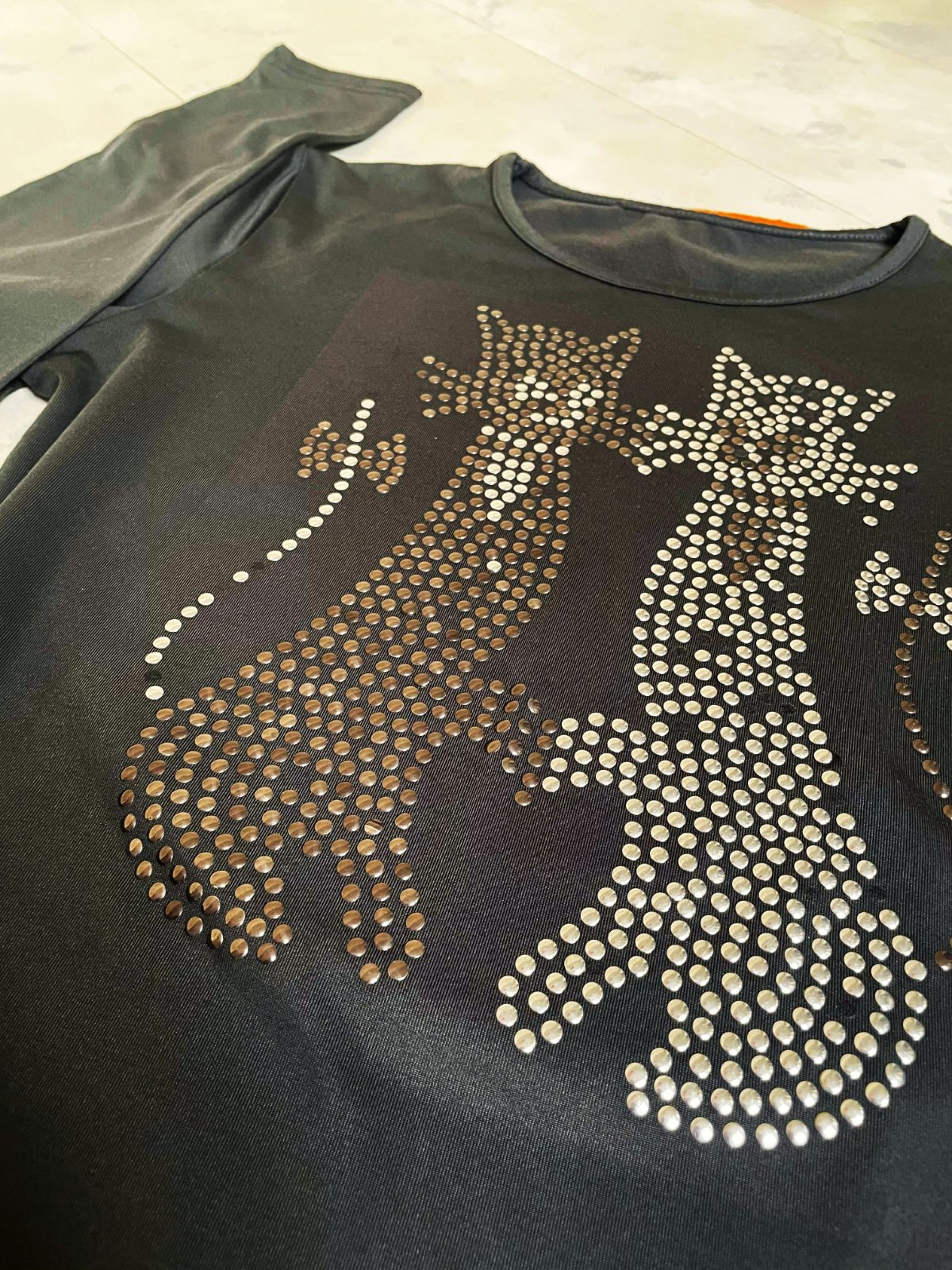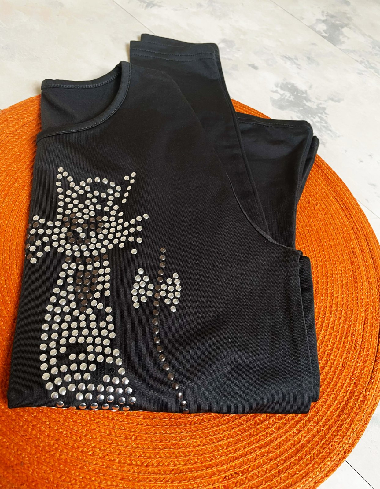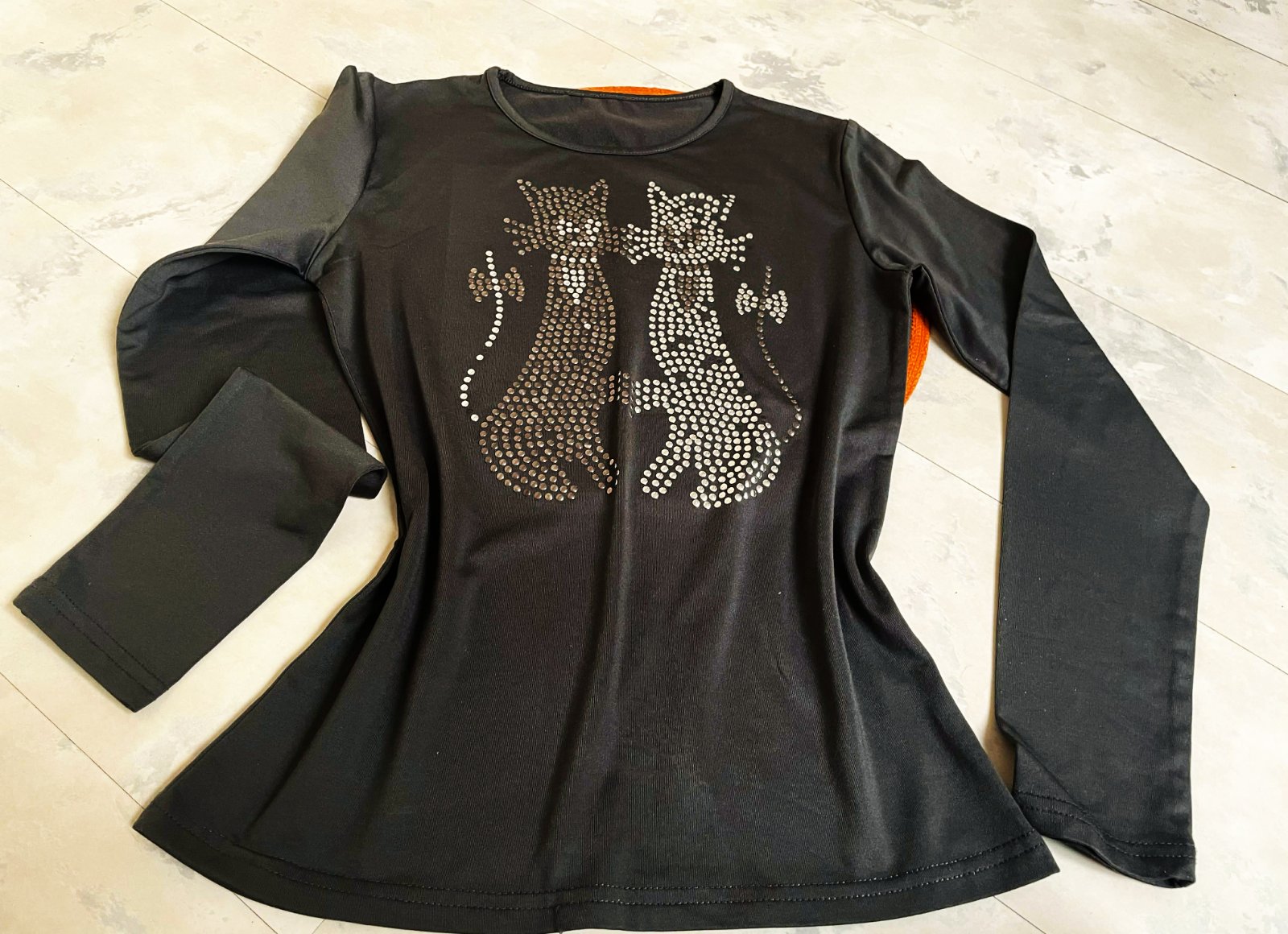 netuctové a neznosené zaujímavé tričko,výborná kvalita,obrázok je z kovových cvočkov,materiál syntetika,95% polyester, 5 % elastan,šírka meraná pod pazuchou 40 x 2 cm, dlžka celkom = 57 cm,ramená 9 cm, vonk. dlžka rukáva 59 cm,farba kovovo - antracitovo čierna &