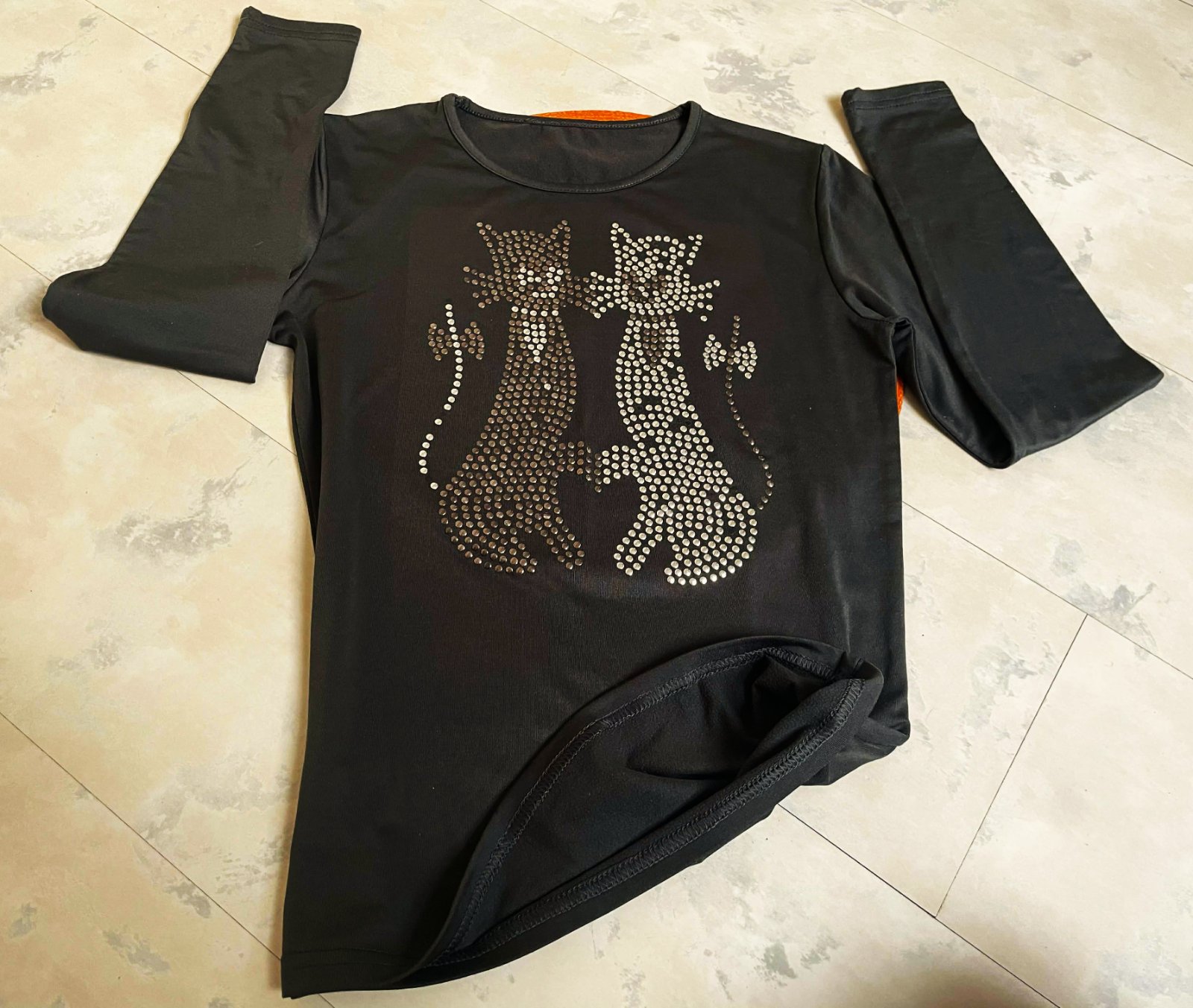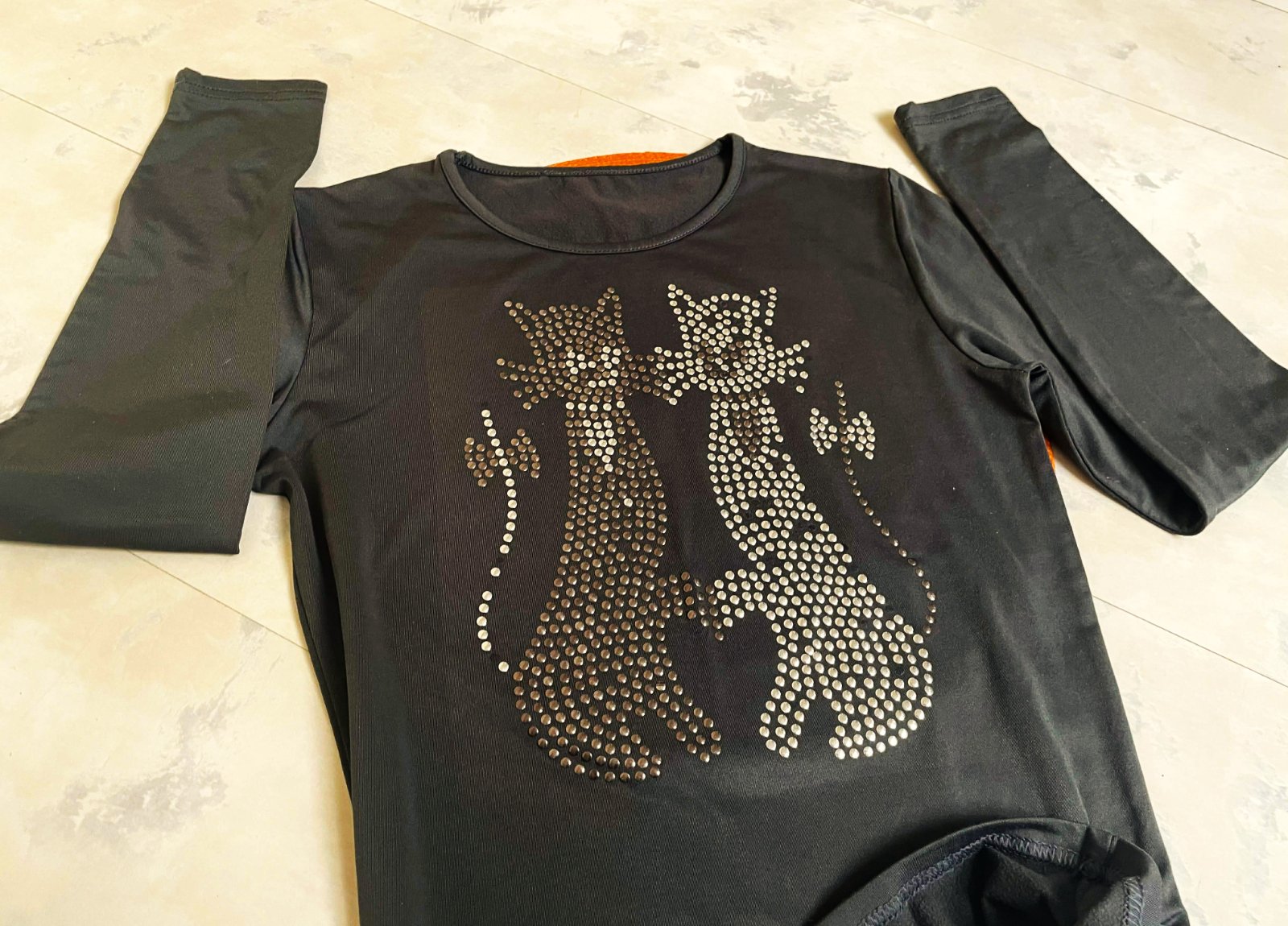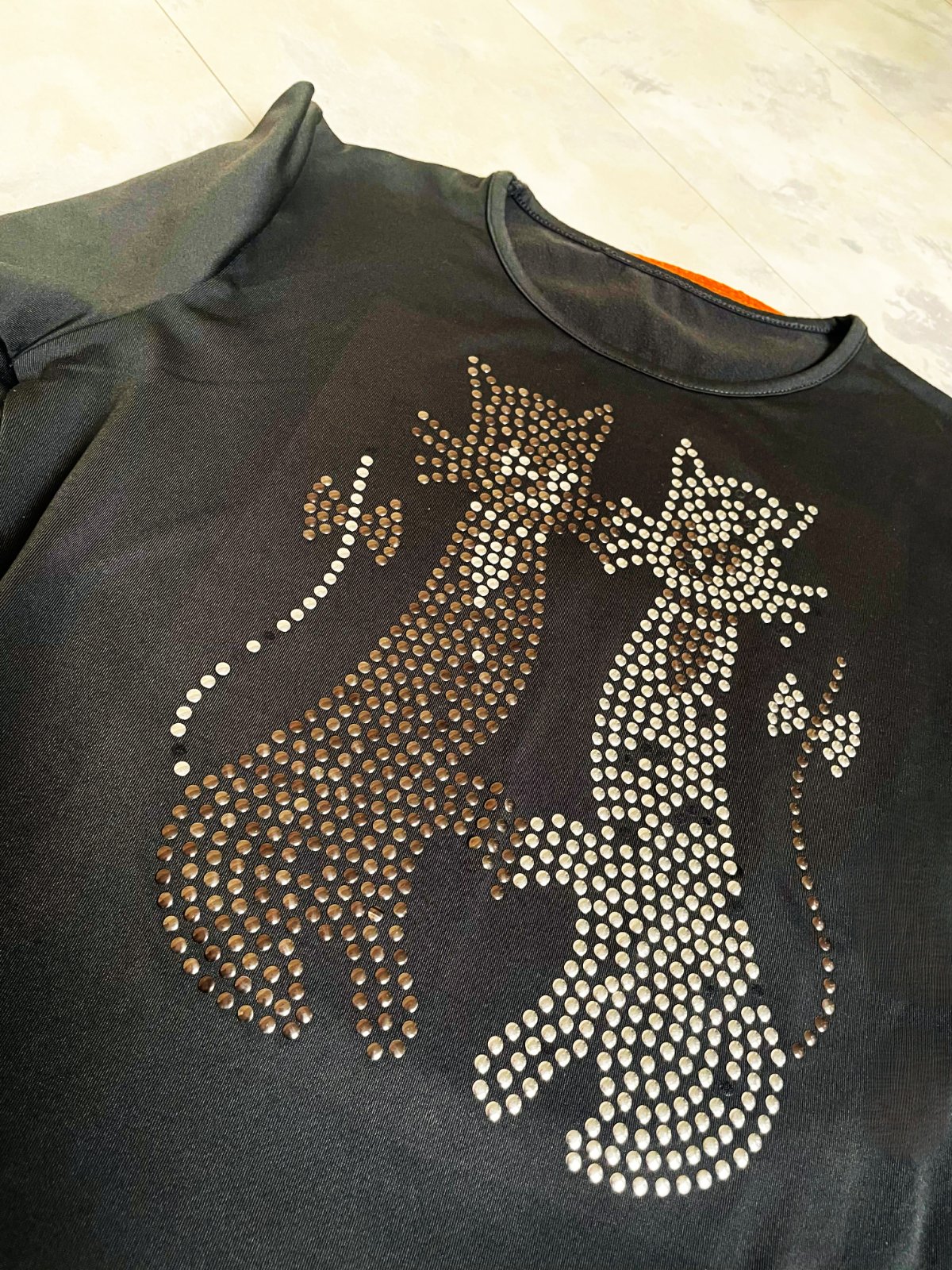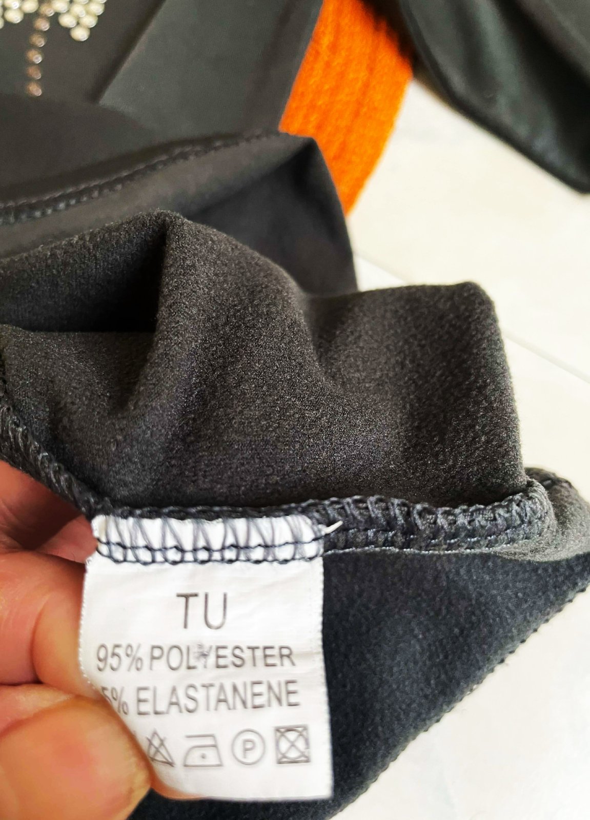 netuctové a neznosené zaujímavé tričko,výborná kvalita,obrázok je z kovových cvočkov,materiál syntetika,95% polyester, 5 % elastan,šírka meraná pod pazuchou 40 x 2 cm, dlžka celkom = 57 cm,ramená 9 cm, vonk. dlžka rukáva 59 cm,farba kovovo - antracitovo čierna &