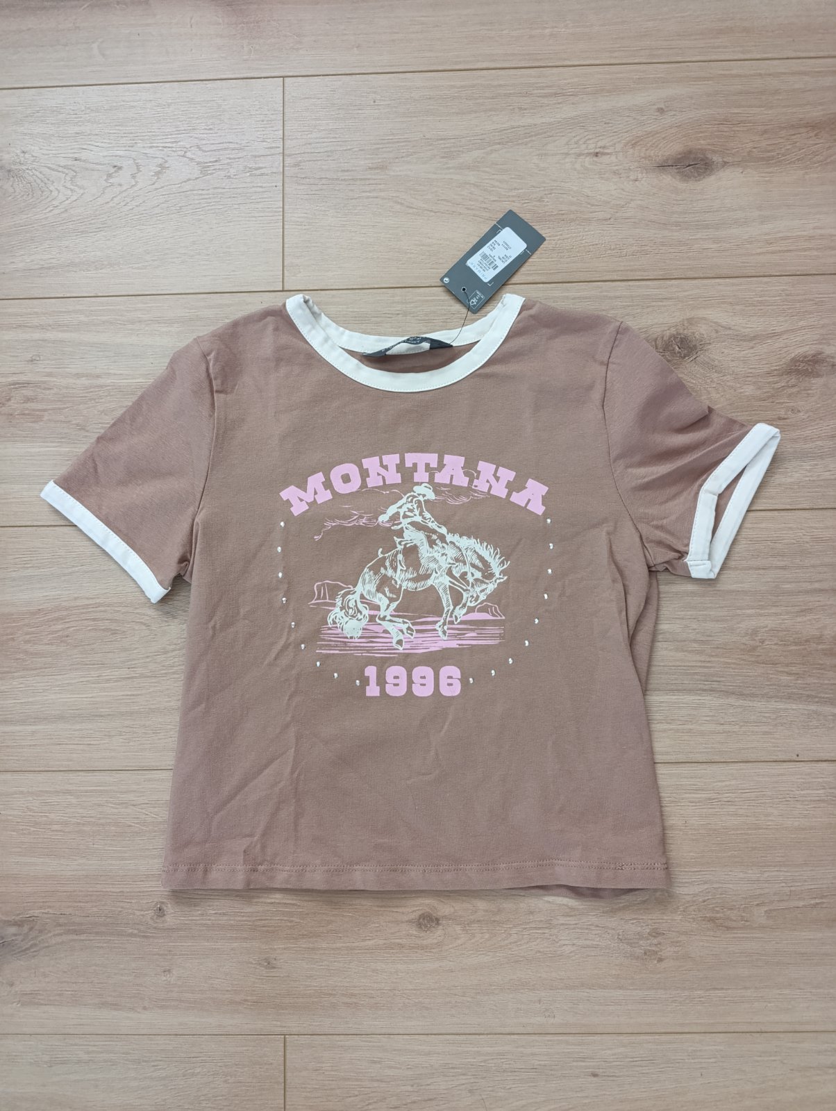 Farba medzi bielou a béžovou - slabulinká béžová. Veľmi pekný text na potlači. Veľkosť: XS Cena: 5€