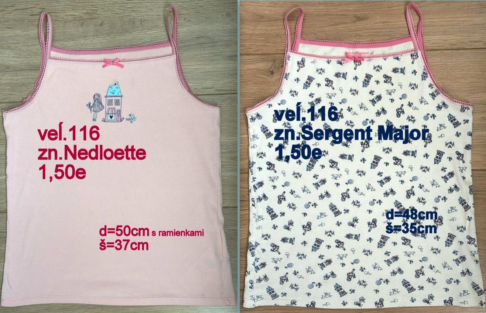 Predám dievčenské tielka 2ks, veĺ.116, zn. Nedloette a Sergent Major, ružové s domčekom: d=50cm s ramienkami, š=37cm,biele modrý vzor: d=48cm s ramienkami, š=35cm, top stav