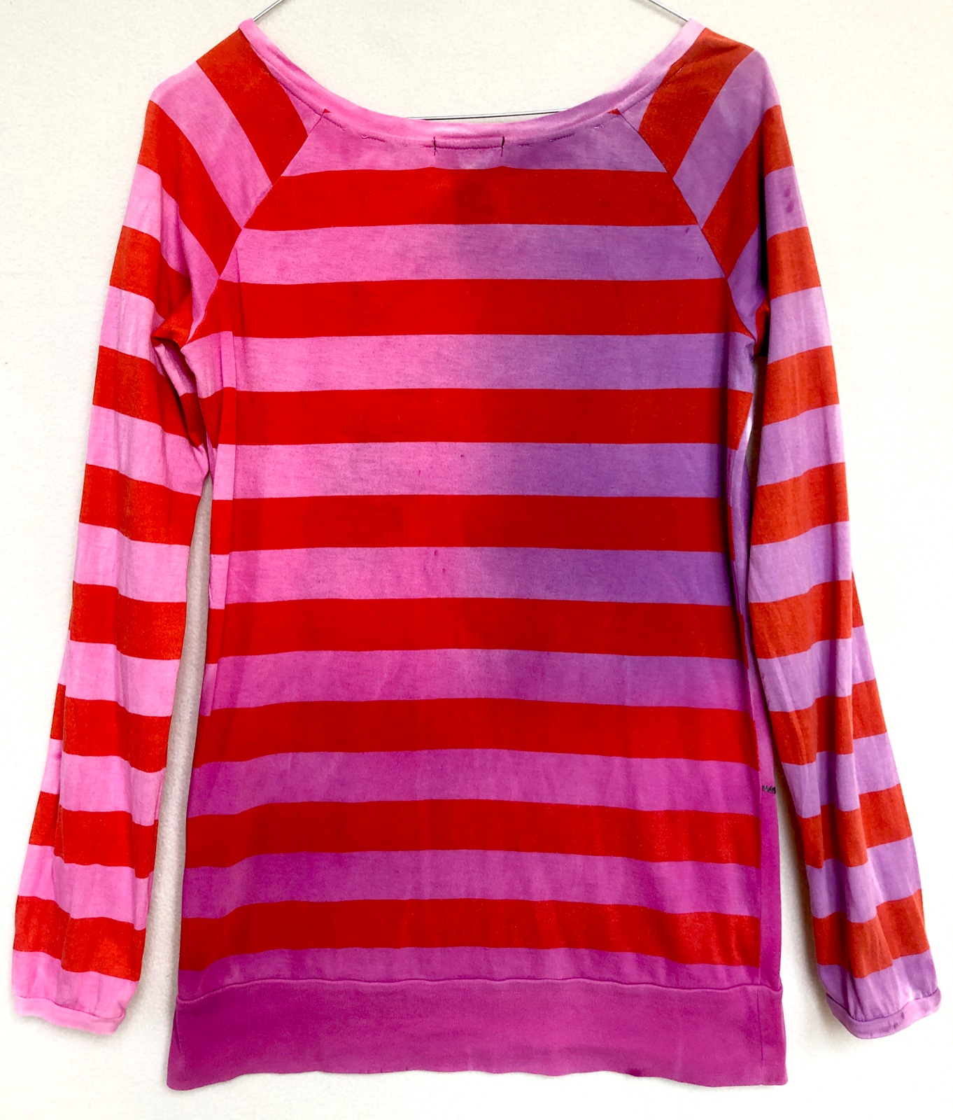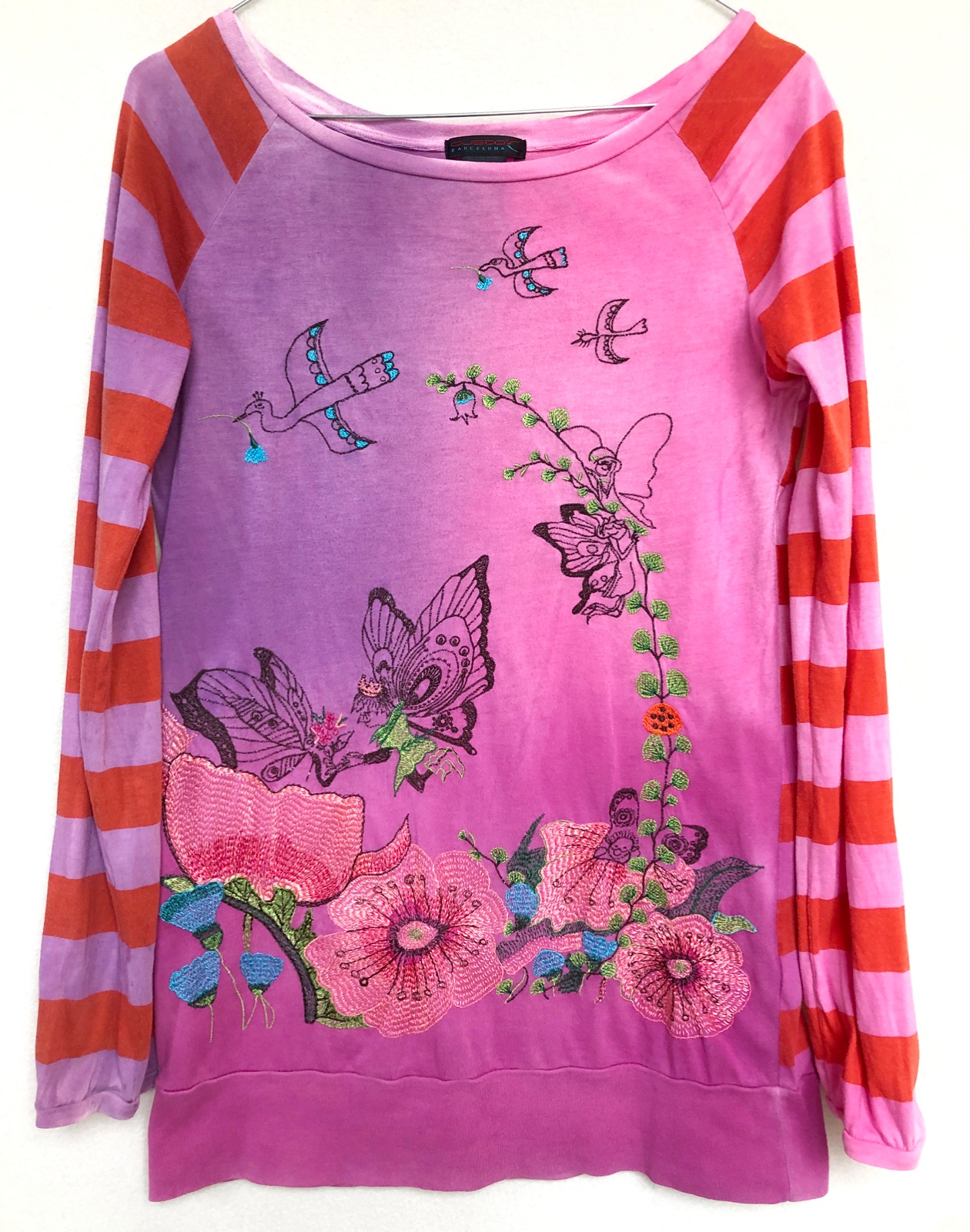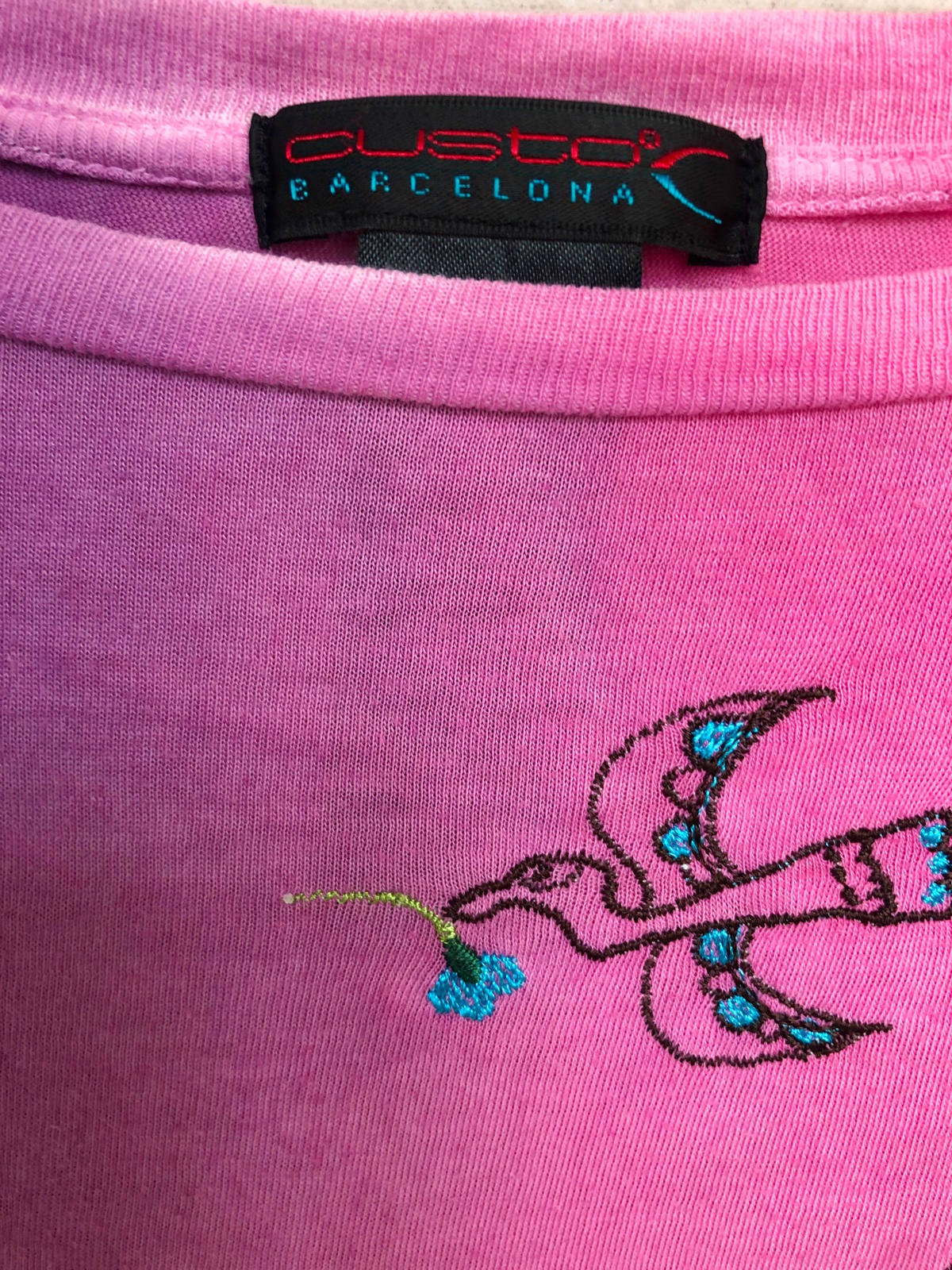 Výrazné tričko obľúbenej značky Custo Barcelona v odtieňoch ružovej, cyklamenovej, fialovej s farebnou výšivkou na prednom diele. Príjemný mäkký bavlnený materiál, vo veľmi dobrom stave, bez poškodení.