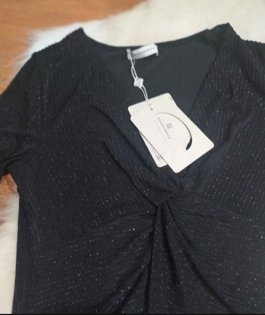 Elegantne priesvitne cierne tricko so stojacikom, dlhym rukavom a upletovym patentom na rukave a s predlzenou vestickou znacky COSE COSI.Povodna PC 29,90. Upletovina cela pretkavana zlatou nitou,na...
