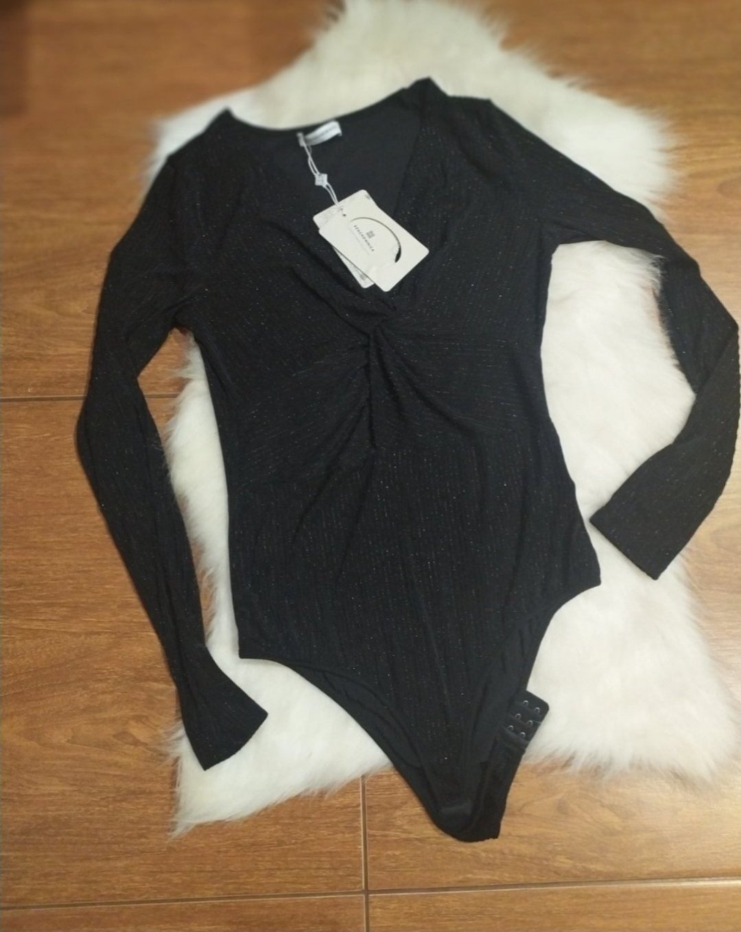 Nadherne cierne sexy body - top s dlhym rukavikom s vyraznou velkou fodrou.Material elasticky polyester,fodra krasna,pevna akoby neoprenova ,drziaca tvar. Dokladam real foto!!! Velkost S ,sedi ...