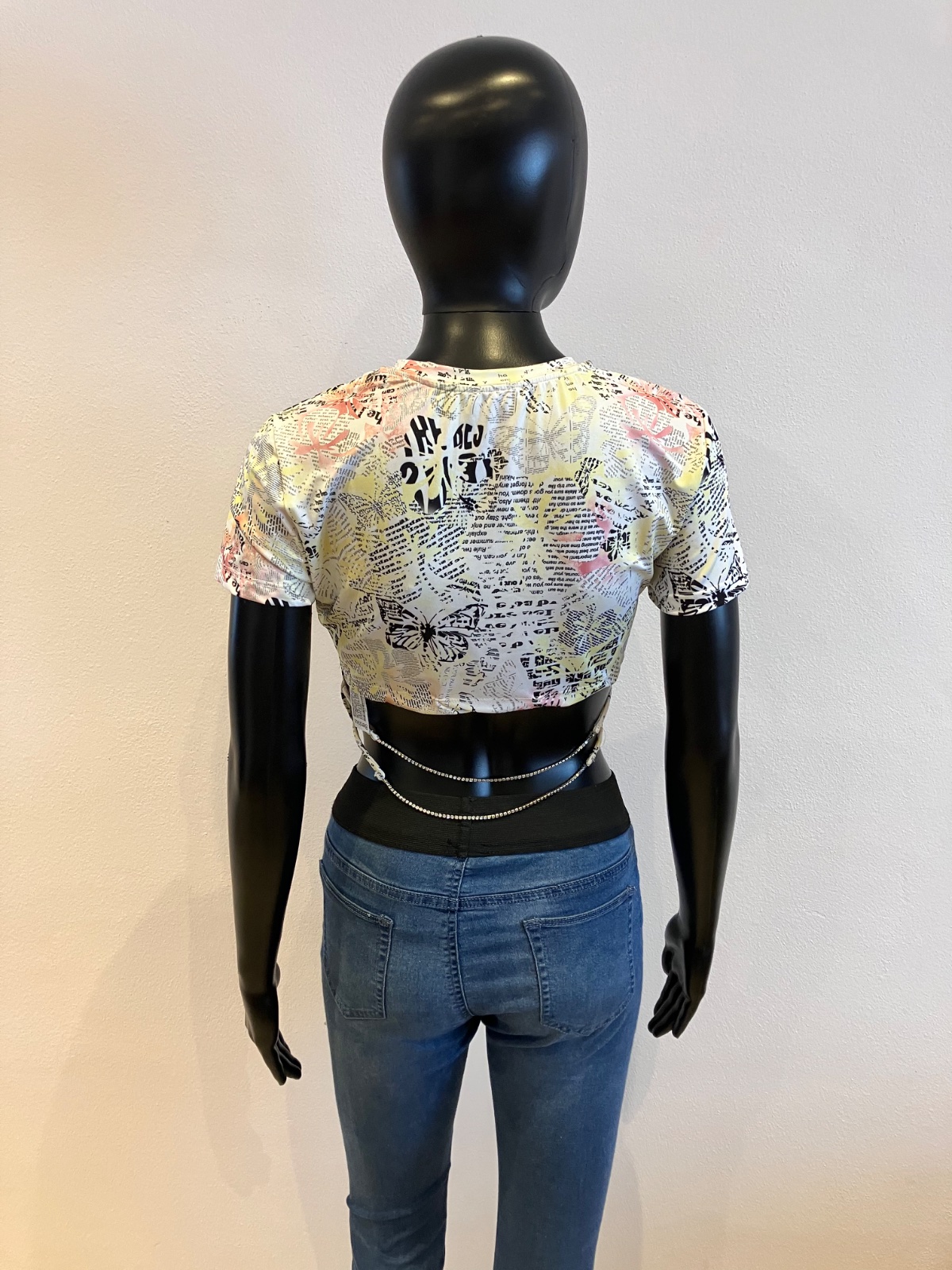 Vzorované,farebné tričko s krátkym rukávom, vzadu kratší strih a s kamienkami, elastické, materiál 87%polyester13%elastan.