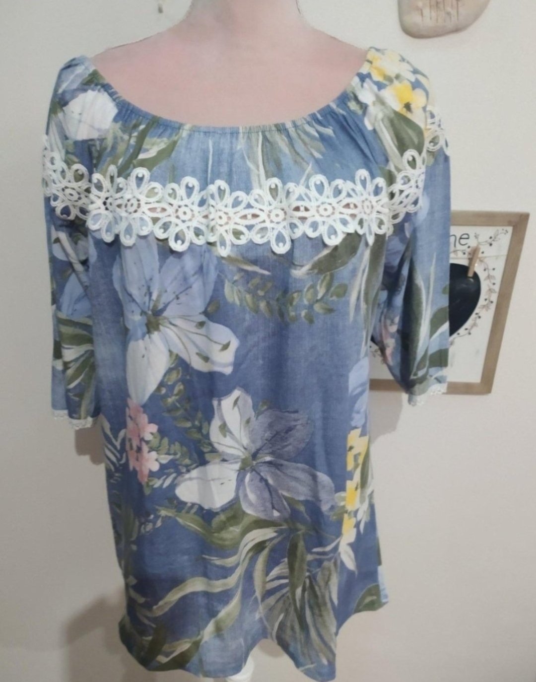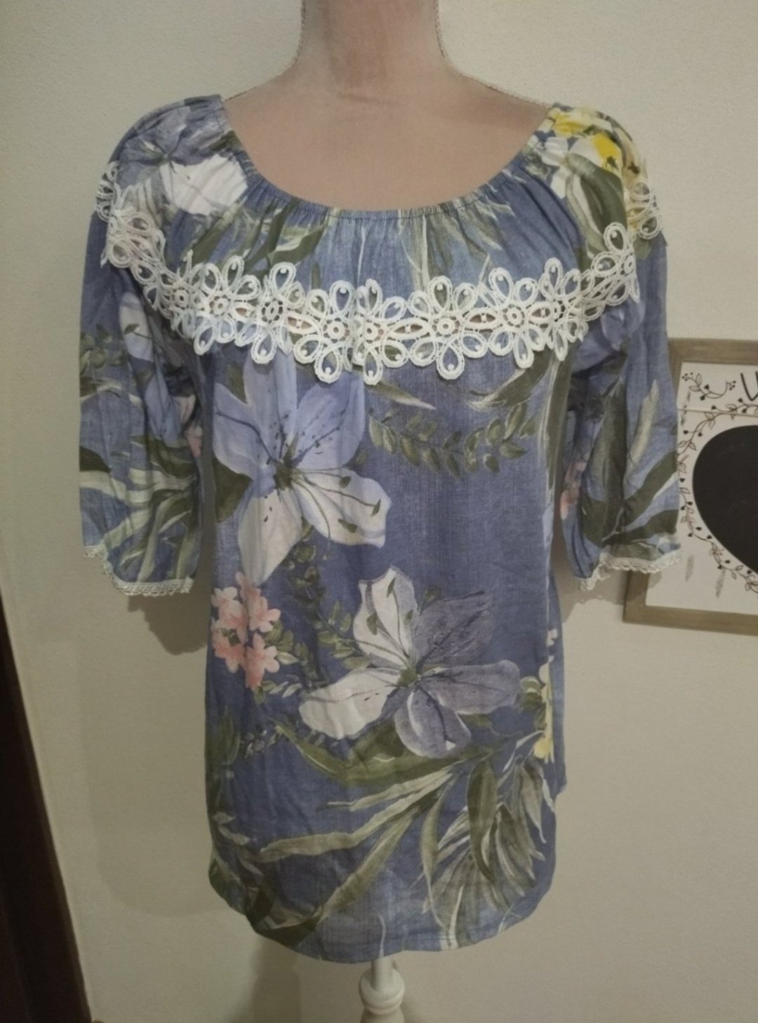 Dámske tričko s krátkym rukávom, okrúhly výstrih, vpredu ako blúzková látka, vzadu tričkovina, nie je elastické, materiál: 67%viskóza,33%polyester/100%polyester. Nový tovar s visačkou. ROZMERY: v...