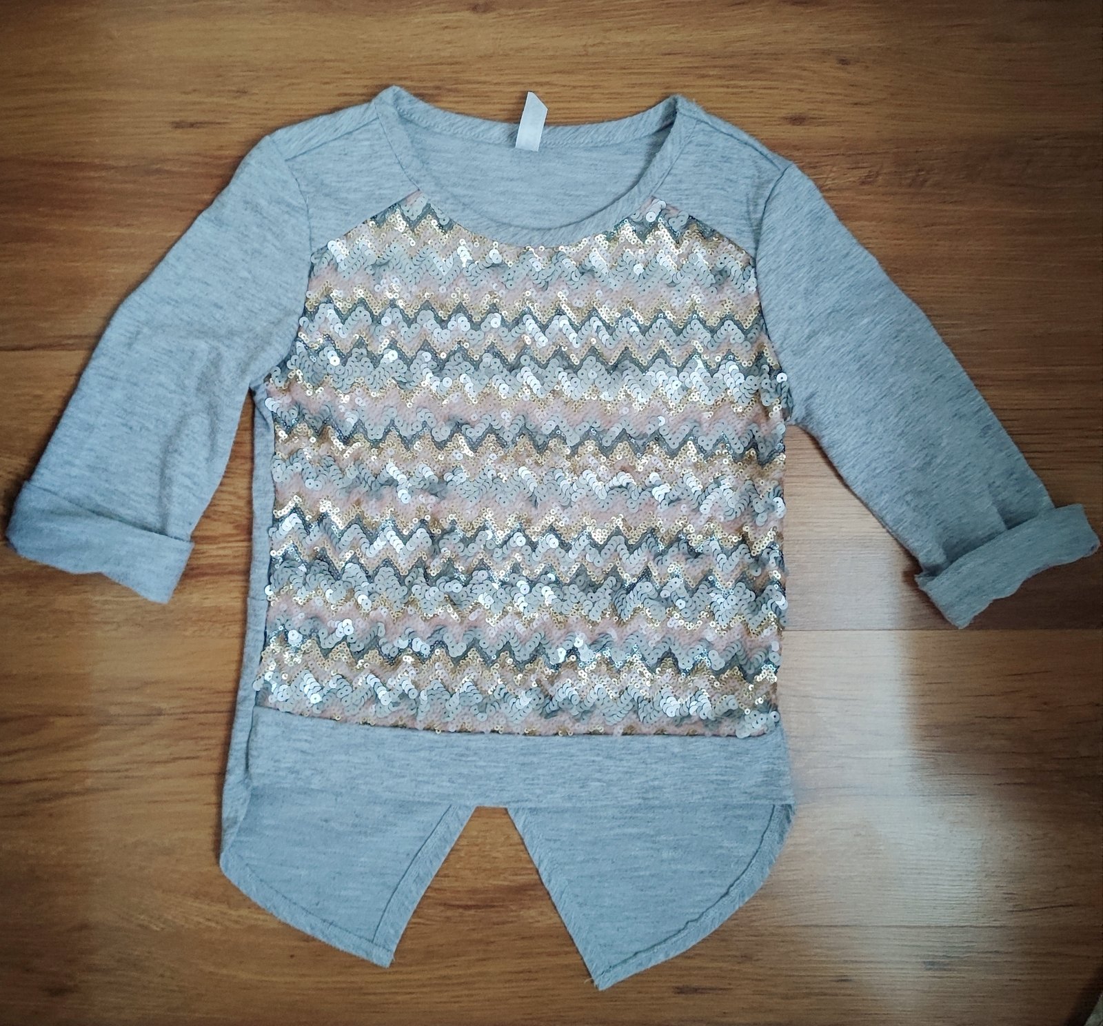 Predám dievčenské tričko bledošedej farby s bliskáčikmi. Veľkosť 134/140. Cena: 4 eurá
