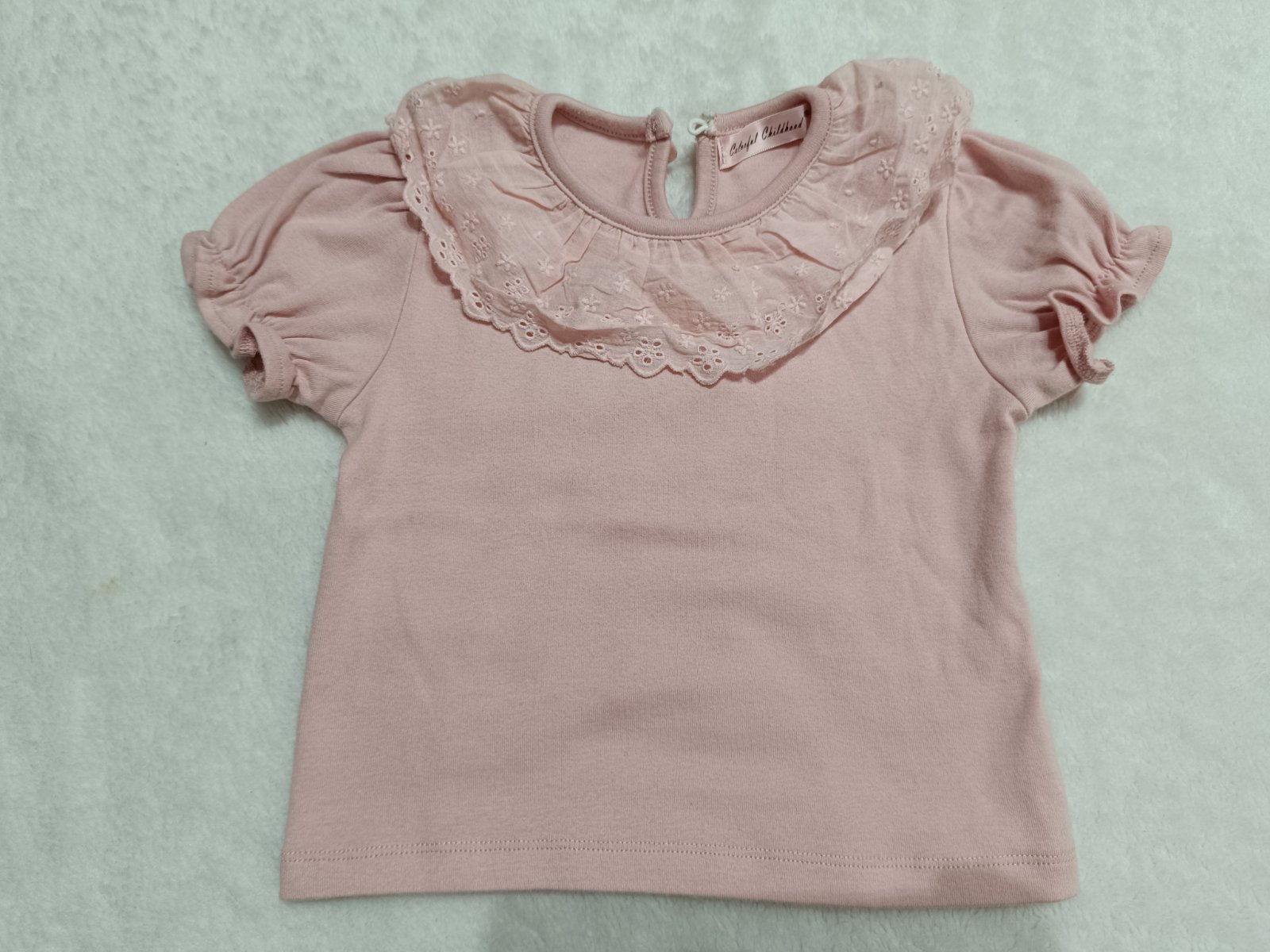 Farba je pekná ružová žiaľ nedarí sa mi ju pekne odfotit je taka baby Pink. Tričko na 9-12 mesiacov..ponosit sa dá aj dlhšie. Top stav