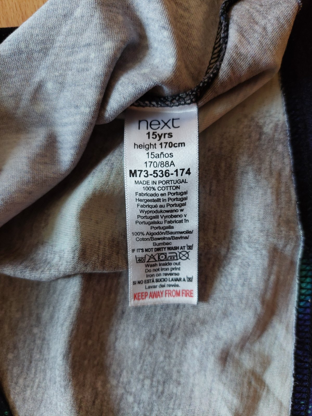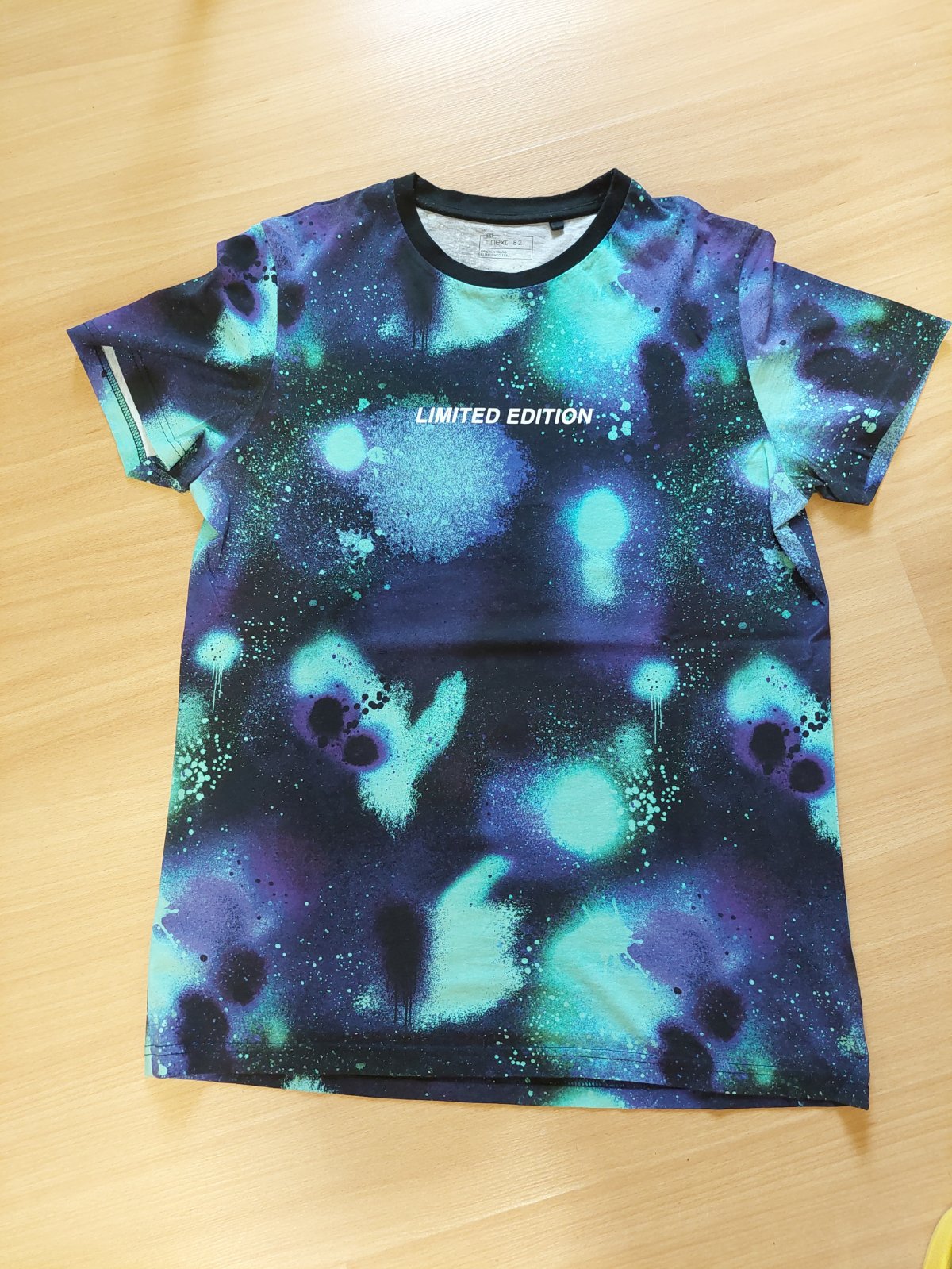 Tričko s motivom Galaxie, zn. Next, velk.pisana 170, ale je mensie (preto som zaradila do velk. 164). Oblecene parkrat, dobry stav, bez poskideni, farba OK.