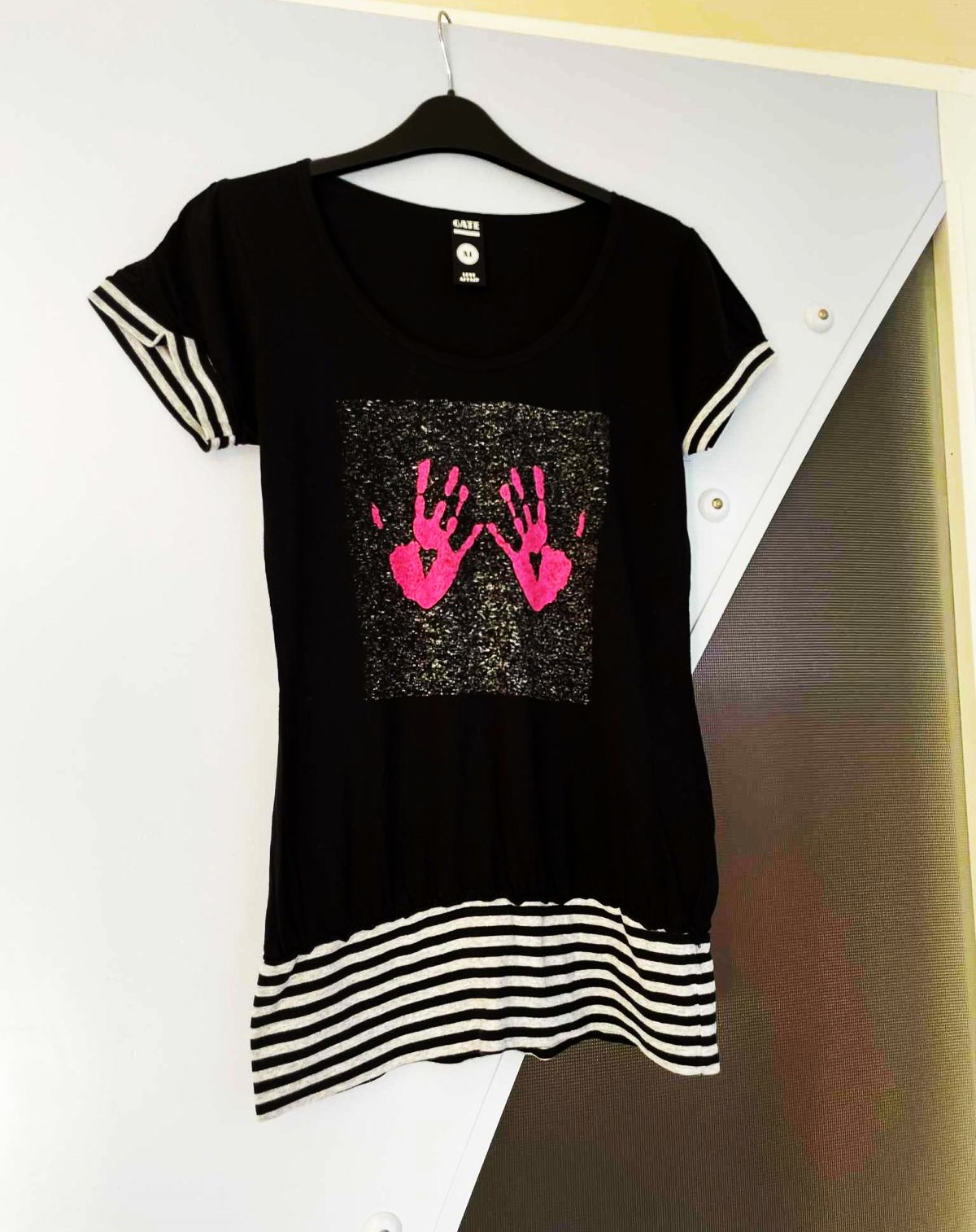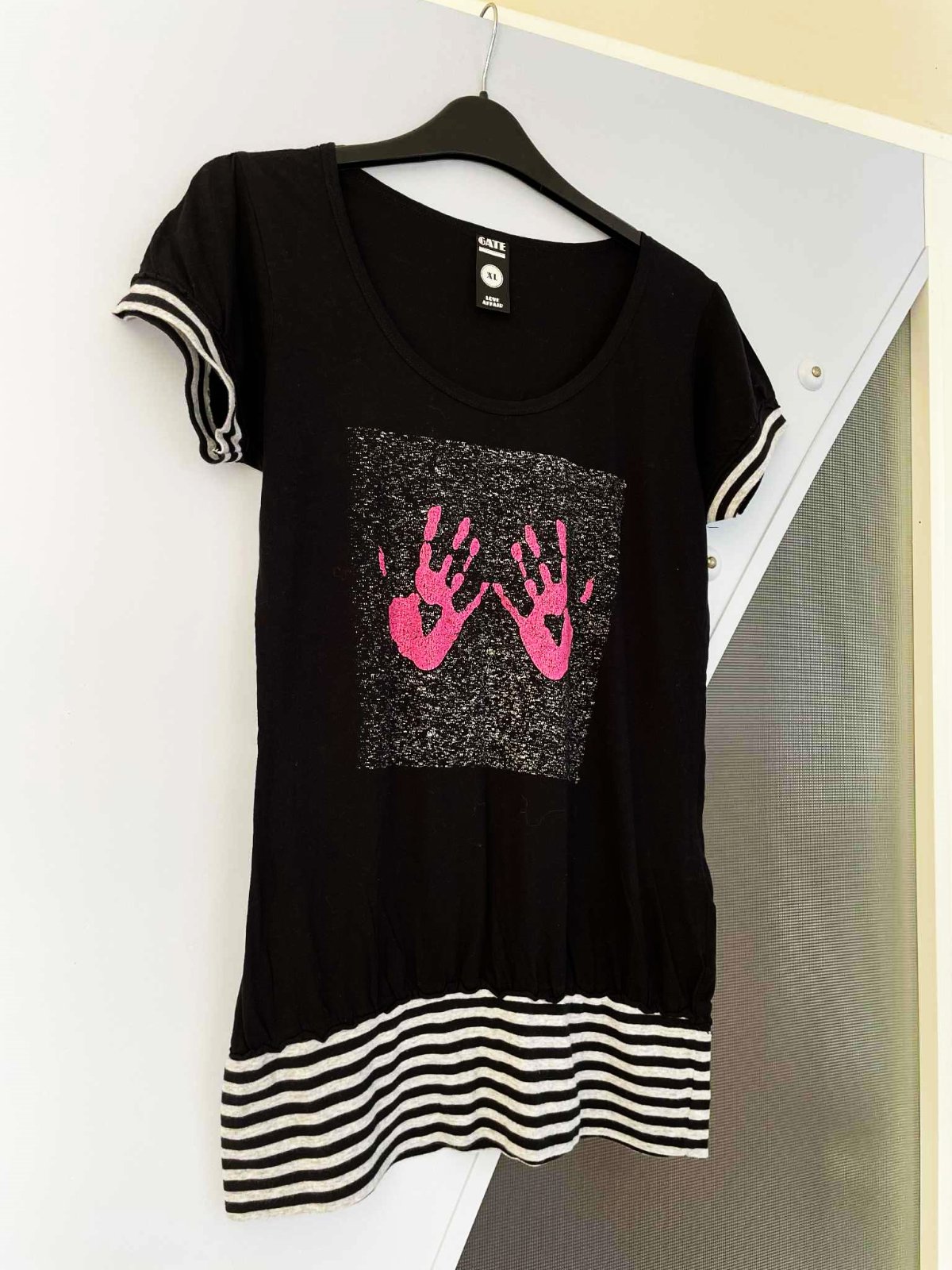 zaujímavé tričko s potlačou, na spodku do jemnej rumby,dlhšie,nikdy nenosené,iba opraté po skladovaní,dĺžka je 67 cm ( včítane rumby ,ktorá má 10 cm ). Šírka v prsiach 45 cm x 2,100% bavlna