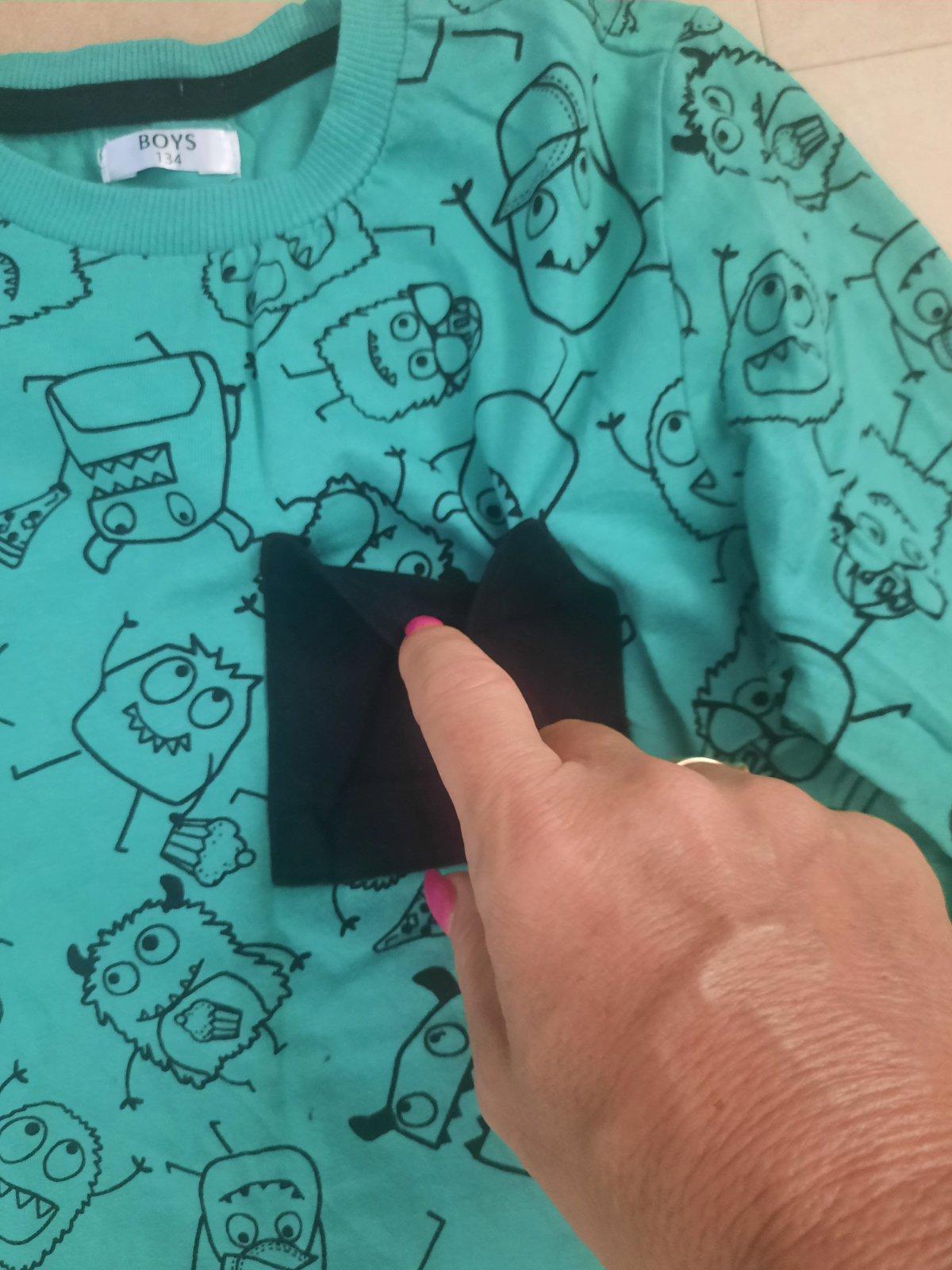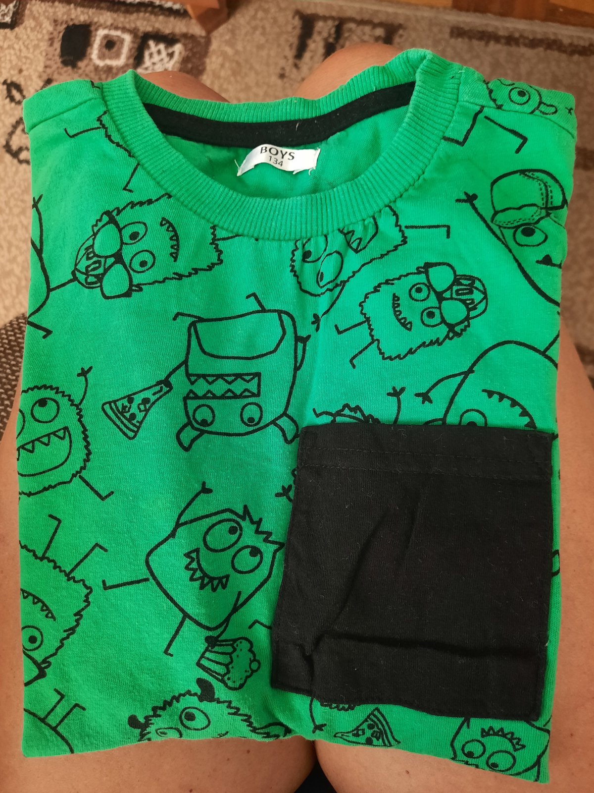 Super bavlnené tričko s veselým vzorom, vpredu malý vačok. Skutočná farba je zachytená na fotke, kde je tričko zložené.