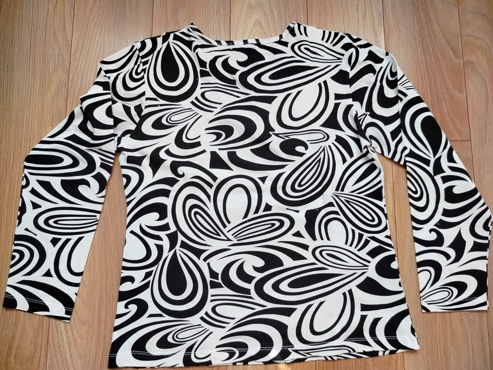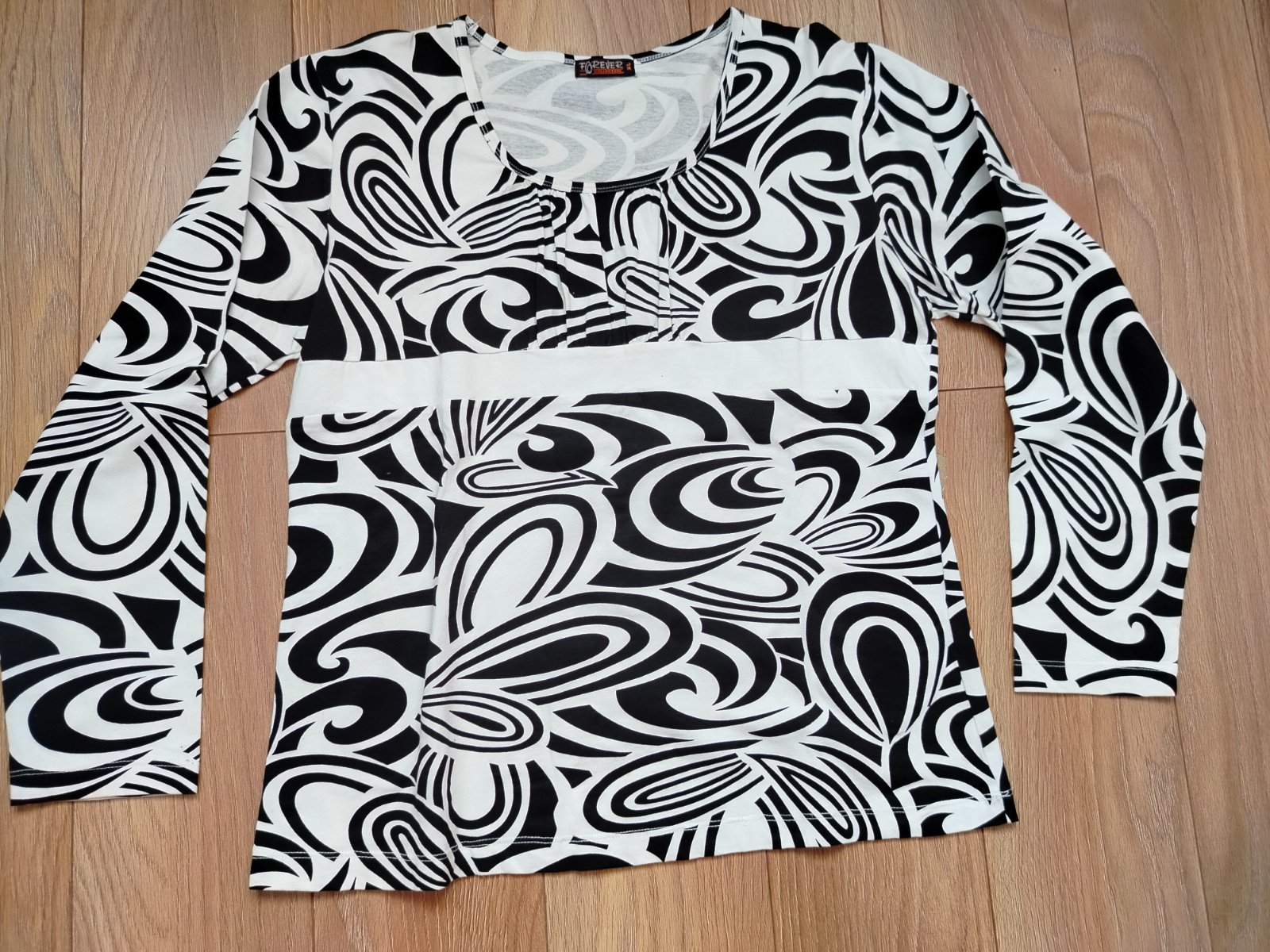 Predám minimálne nosené dámske tričko/blúzku TOPEDEE – výrazný čierno-biely vzor. Minimálne nosená (takmer ako nová), zloženie 90%bavlna 1% elastan, prijemný materiál na nosenie, dobre sa kombinuje s nohavicami aj legínami. Farba: čierno-biela (dramatický swirl / abstraktný vzor).