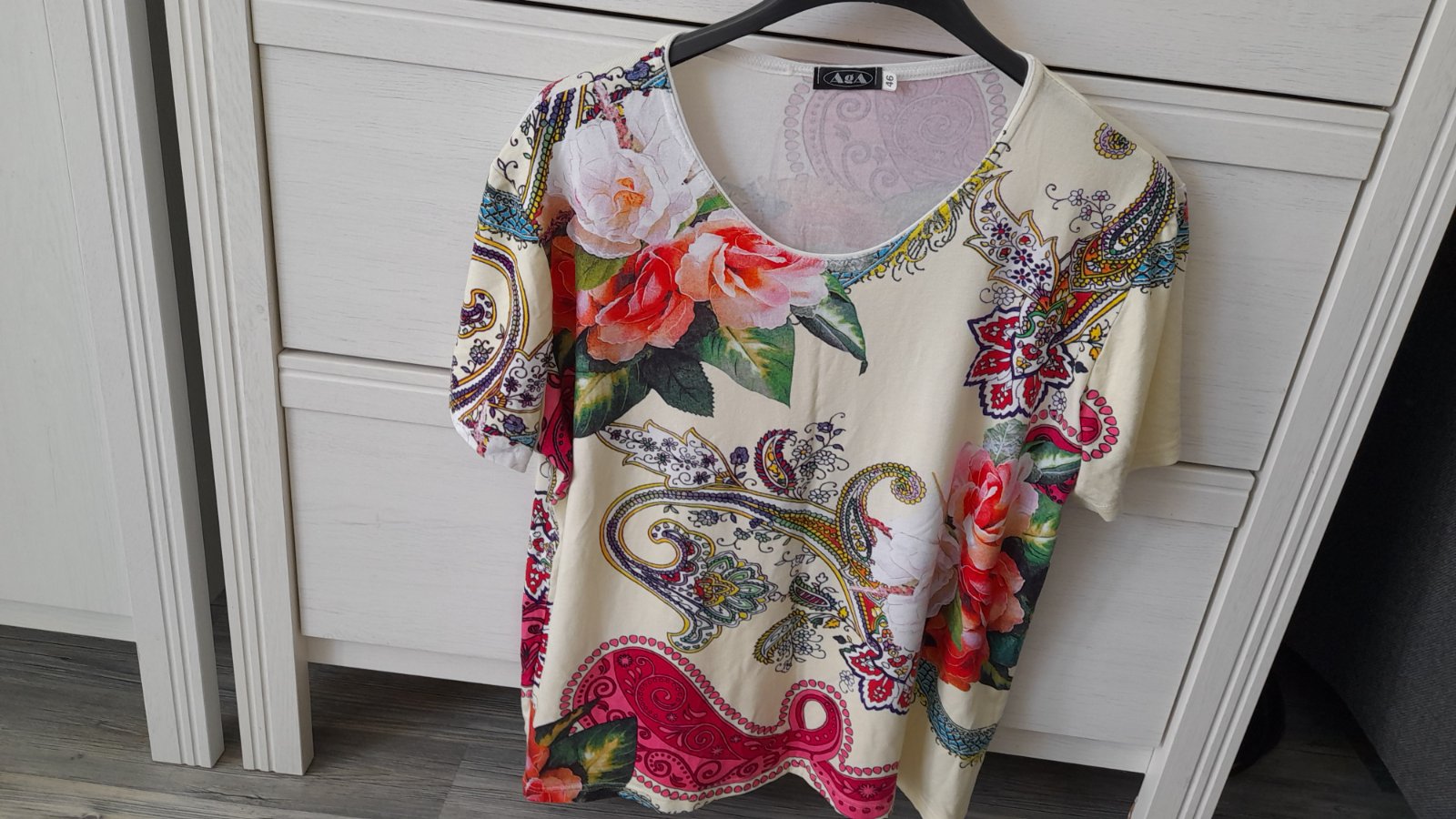 Posuvam krasne tričko, 95% viskoza, 5% elastan, pise velk 46 ale kludne XL, 42