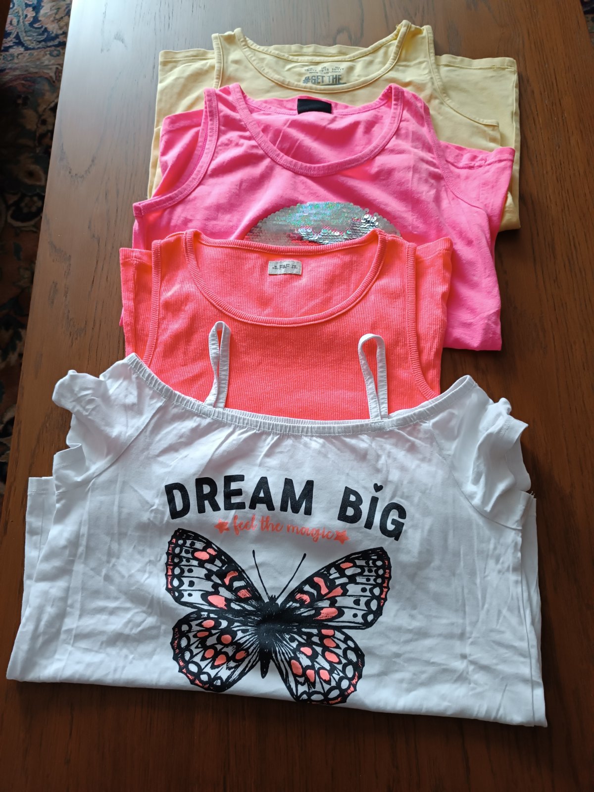 Ponúkam na striedačku nosené tielka. Žlté a lososove bez obrázkov F&F, ružové s obrázkom Page 146/152, biele s motýľom C&A. Pekný nosený stav, poškodenia som nenašla.