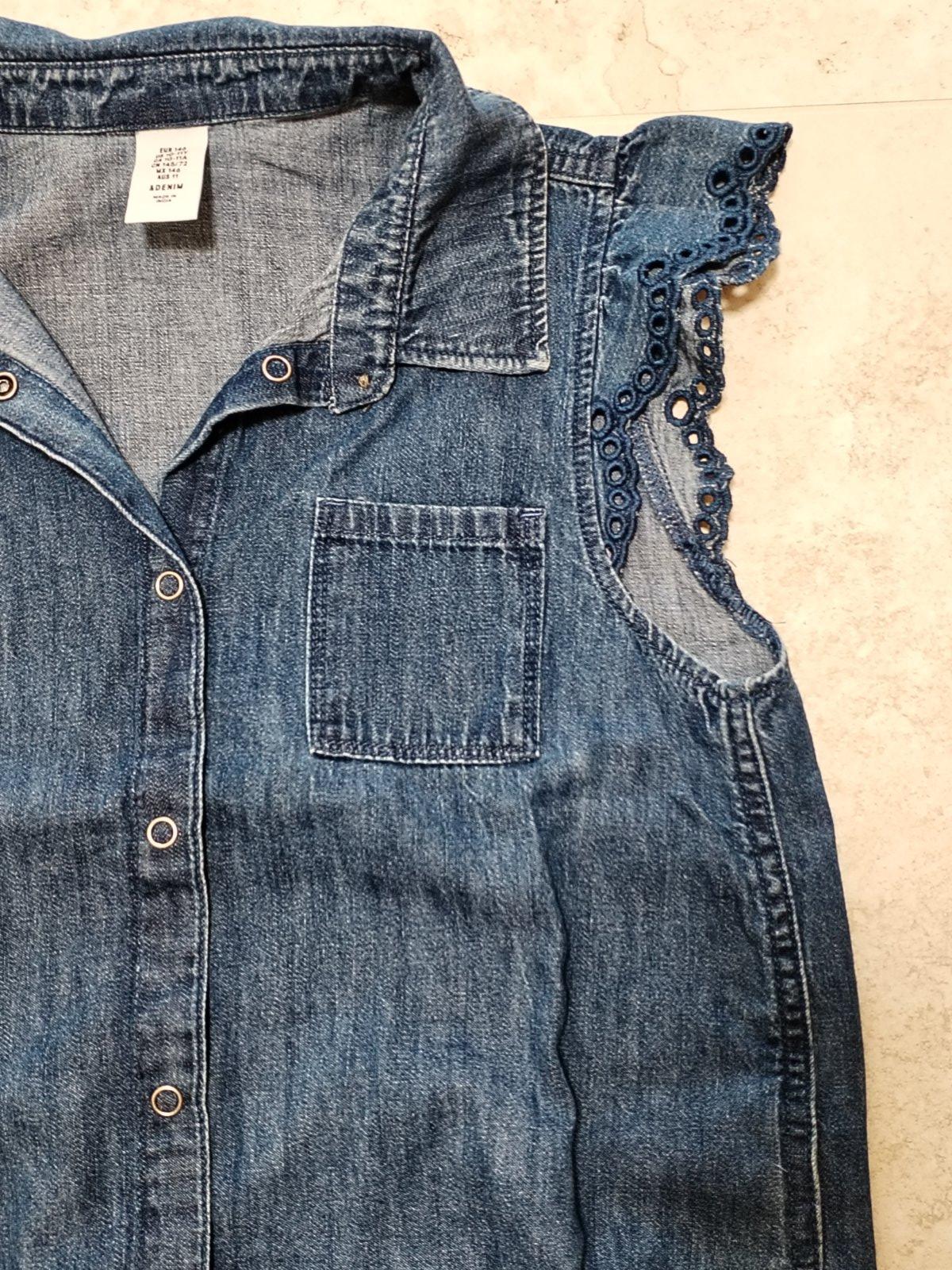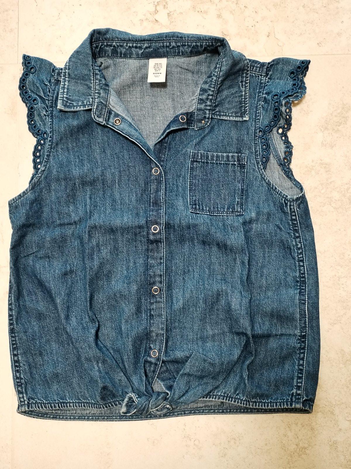 Dievcenske tricko/bluzka H&M vel. 146, tmavomodra imitacia rifloviny, zapinanie na cvoky, na bruchu stylovy uzol, dlzka 45 cm, motylie rukavy, tenske, vynikajuci stav
