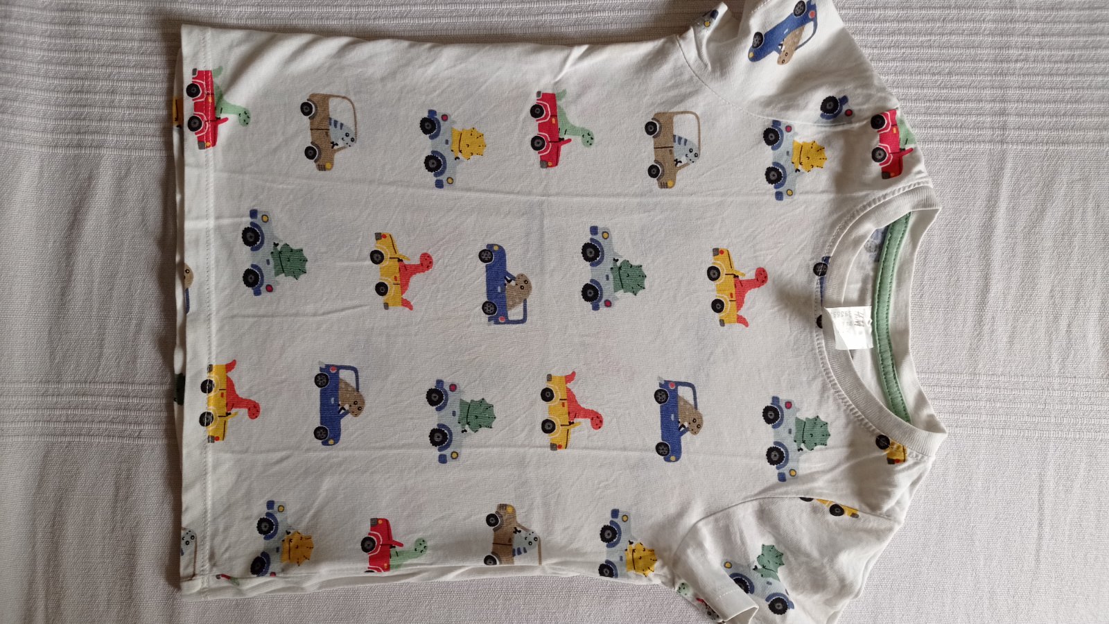 Krasne tricko, motiv dinosaurov a auticka. Nosene, ake bez poškodenia.