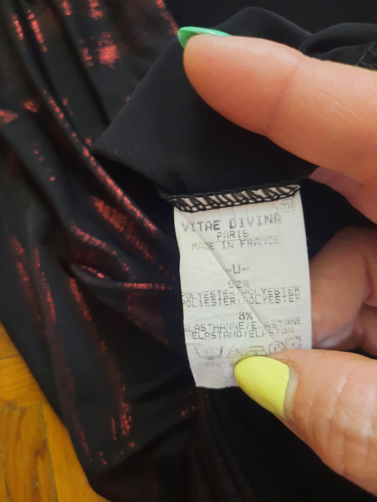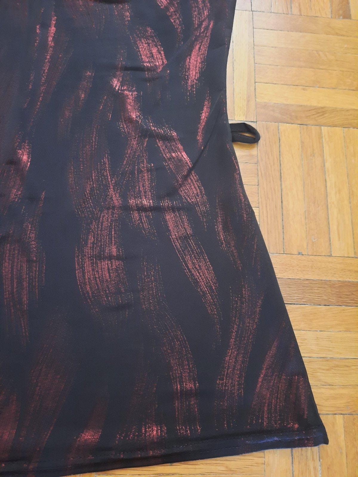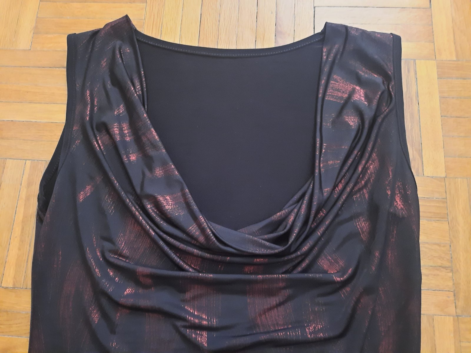 Zaujímavý elastický top čiernej farby v kombinácii s trblietavou bronzovou. Niekde je taká lesklá tá látka. Výstrih okolo krku je "voda". Má aj pútka na opasok.