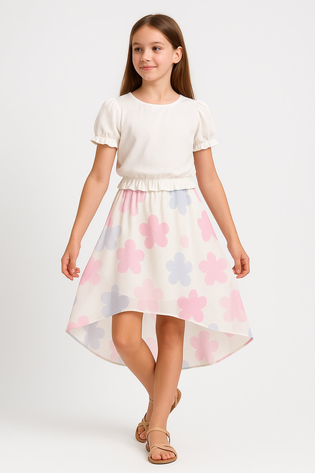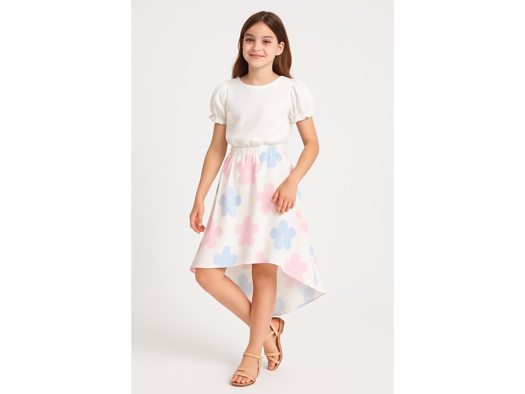 Jemný a elegantný dievčenský top je ideálnou voľbou na leto, slávnostné chvíle aj bežné nosenie. Vďaka krátkym balónovým rukávom a volánovému zakončeniu pôsobí romanticky a zároveň moderne. Elastický pás zabezpečuje, že top dobre drží a krásne sedí na postave.