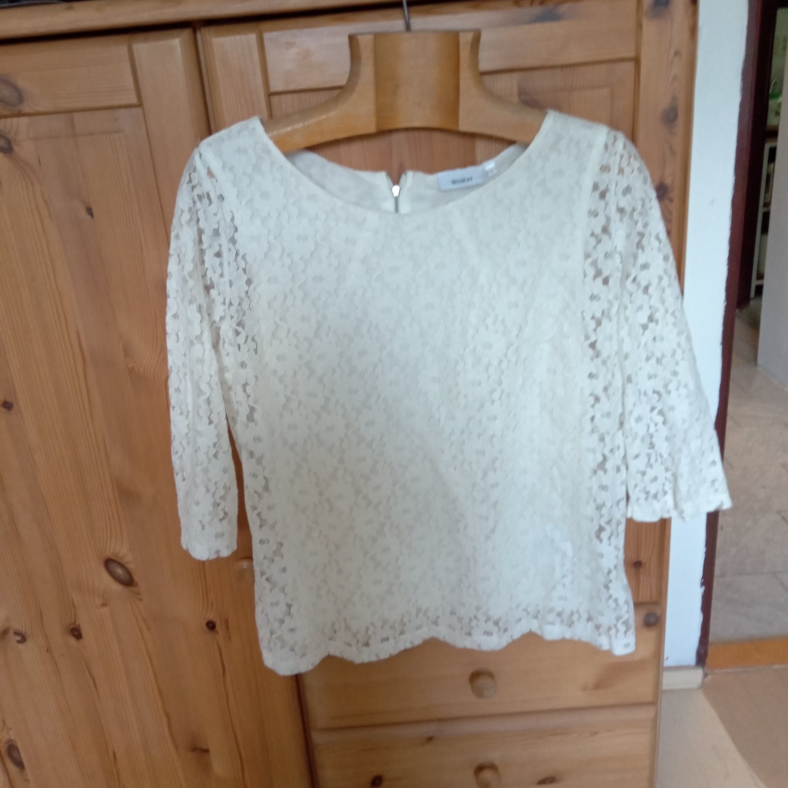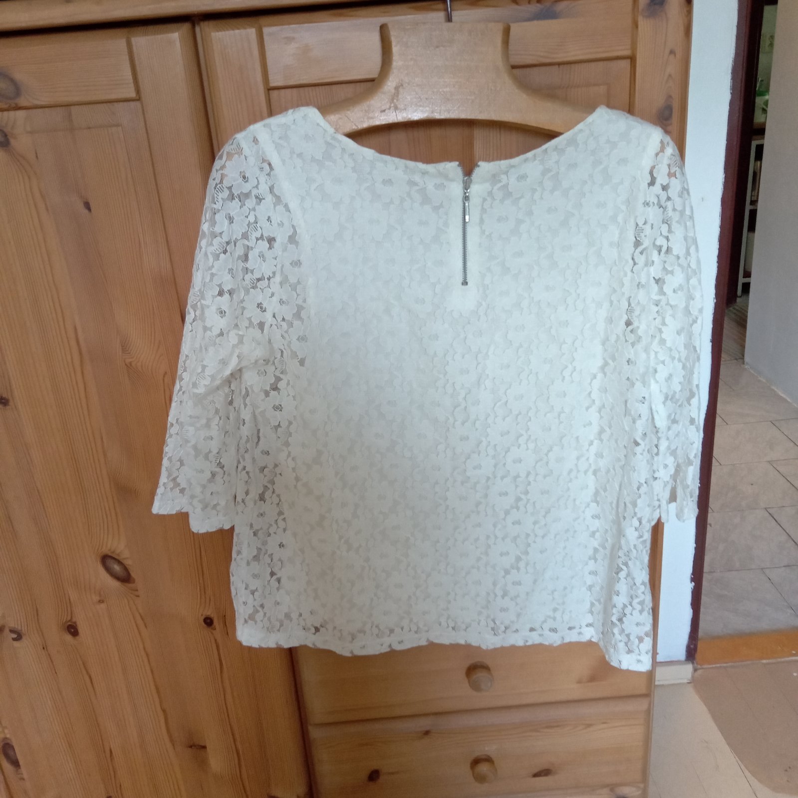 Predám bluzkové tričko, farba maslová biela, veľkosť L,3/4rukav.Predna aj zadná časť podsita tričkovinou. Šírka v podpazuší 52cm, celková dĺžka 55cm.Stav: bezchybný (minimálne nosené).