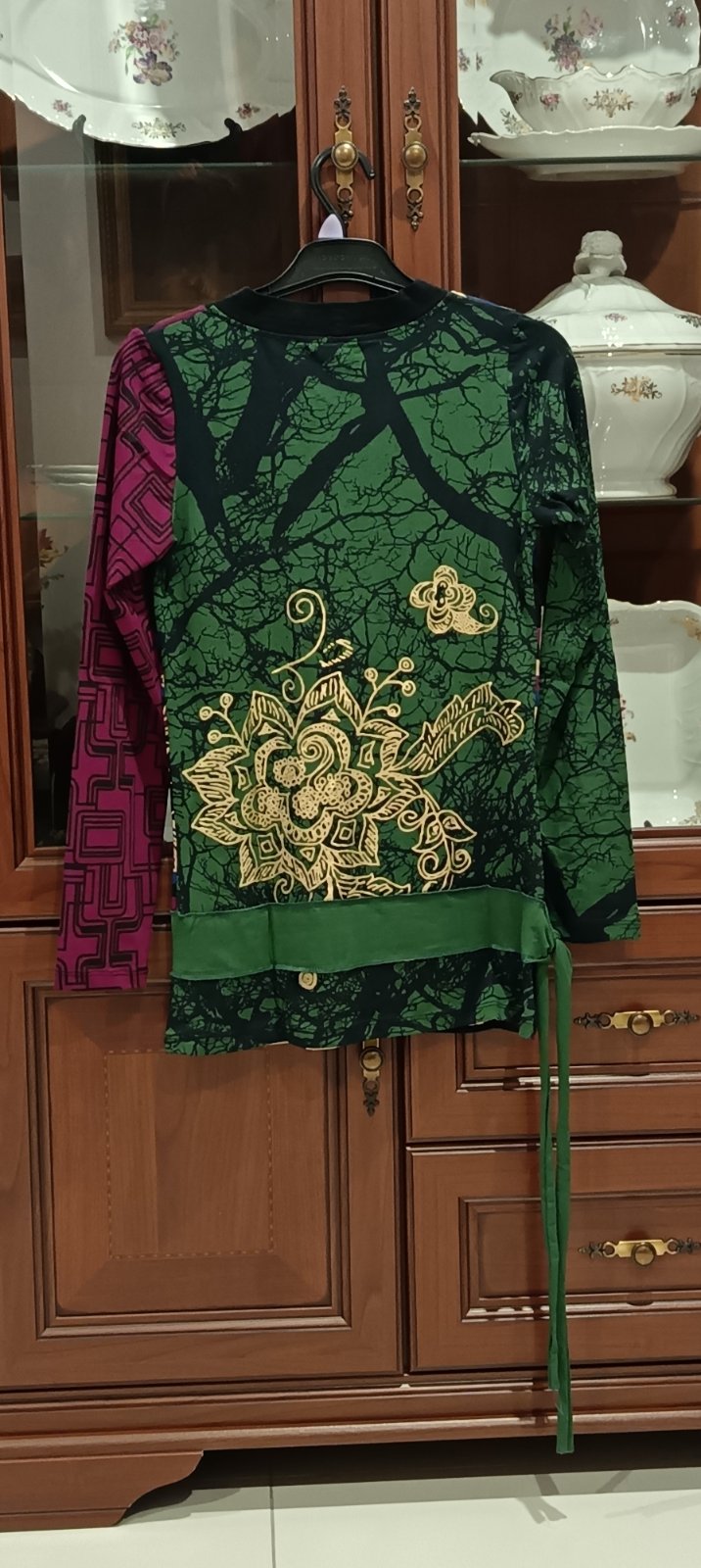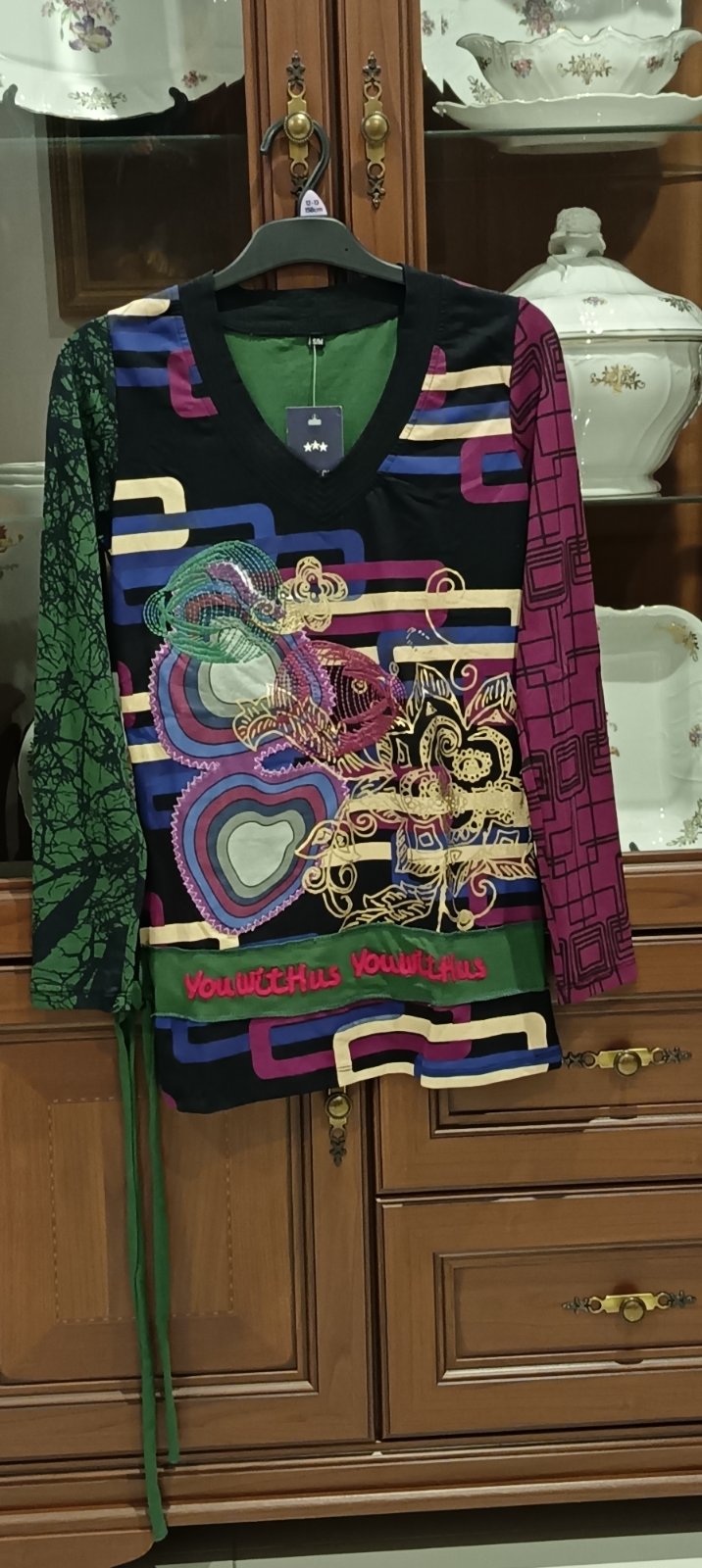 Krásne nové tričko s visačkou na štýl Desigual, jemne predĺžené s uväzovaním na boku, veľkosť označená S/M, 95% bavlna, 5% elastan.