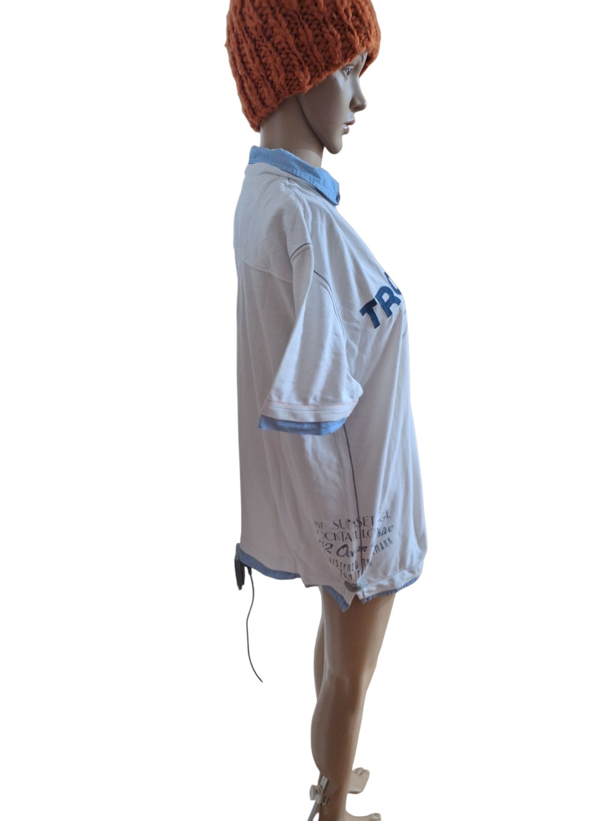 Pánske letné tričko s krátkym rukávom. Bledomodré s potlačou. Značka Tom Tailor. Veľkosť XL. Zachovalé, bez poškodenia. Rozmery: dĺžka 72 cm, šírka v podpazuší 2 x 61 cm.