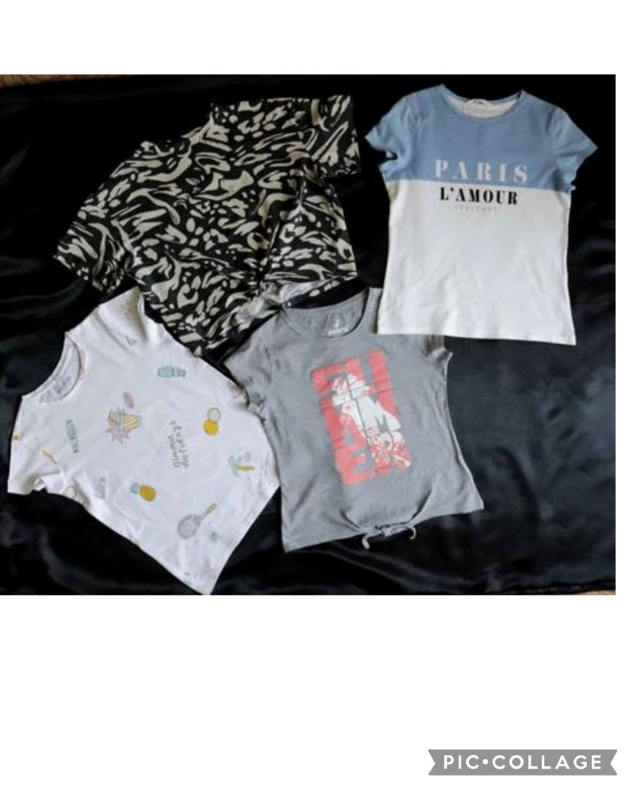 4 ks tričiek v bezchybnom stave okrem mini chybičky na bielom tričku Reserved. Bielo - modré tričko a vzorované tričko sú H&M, sivé je Peppets, biele s tropickým vzorom je Reserved