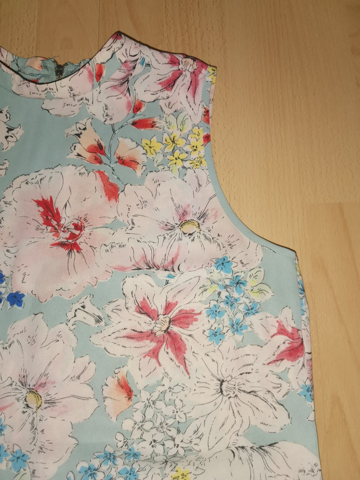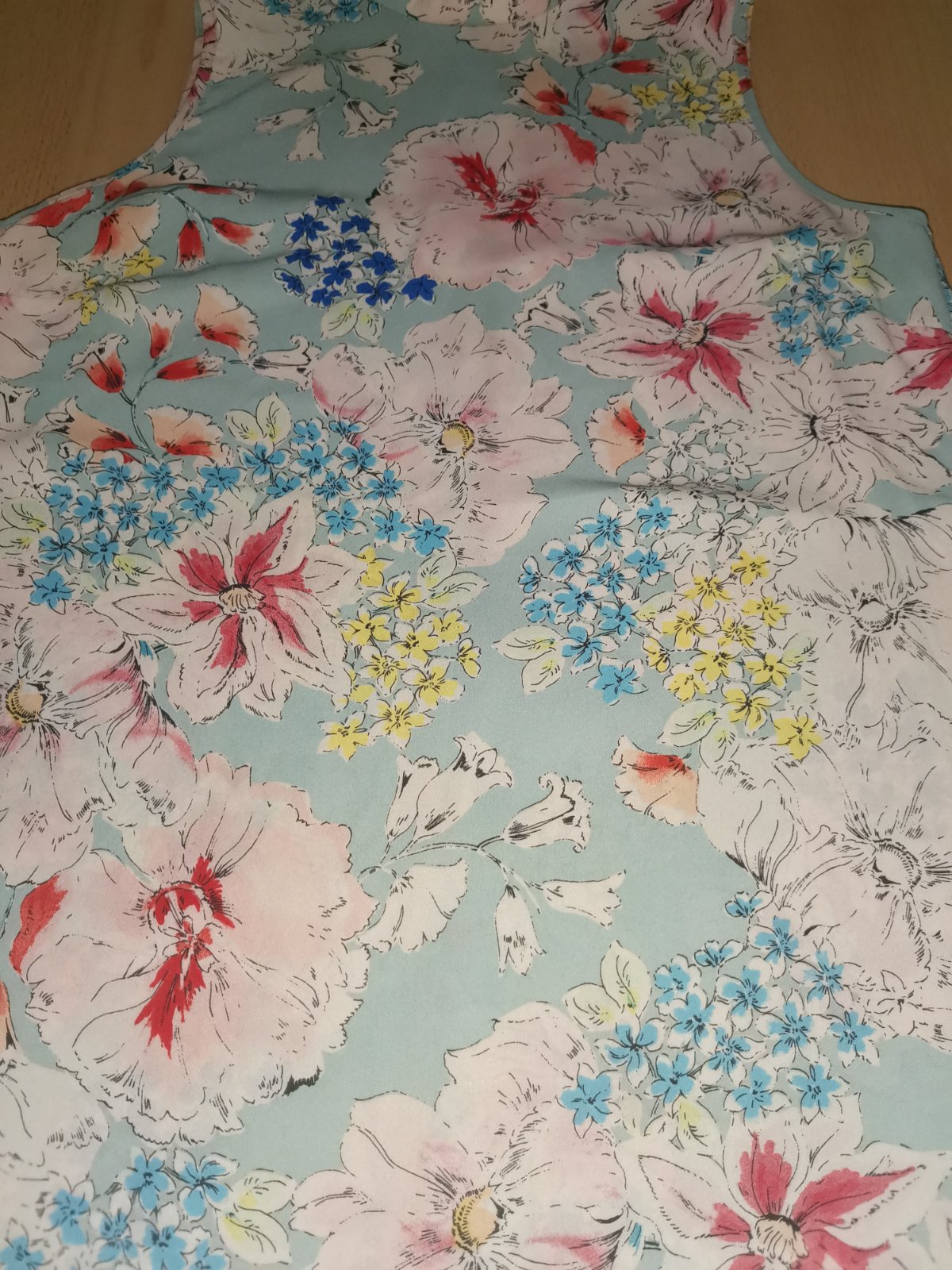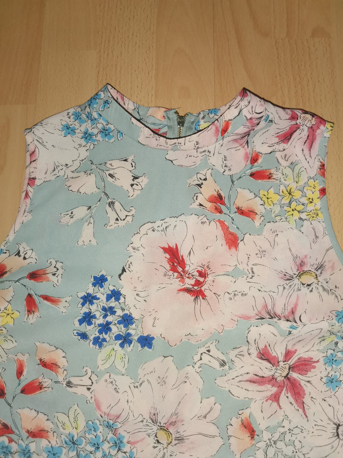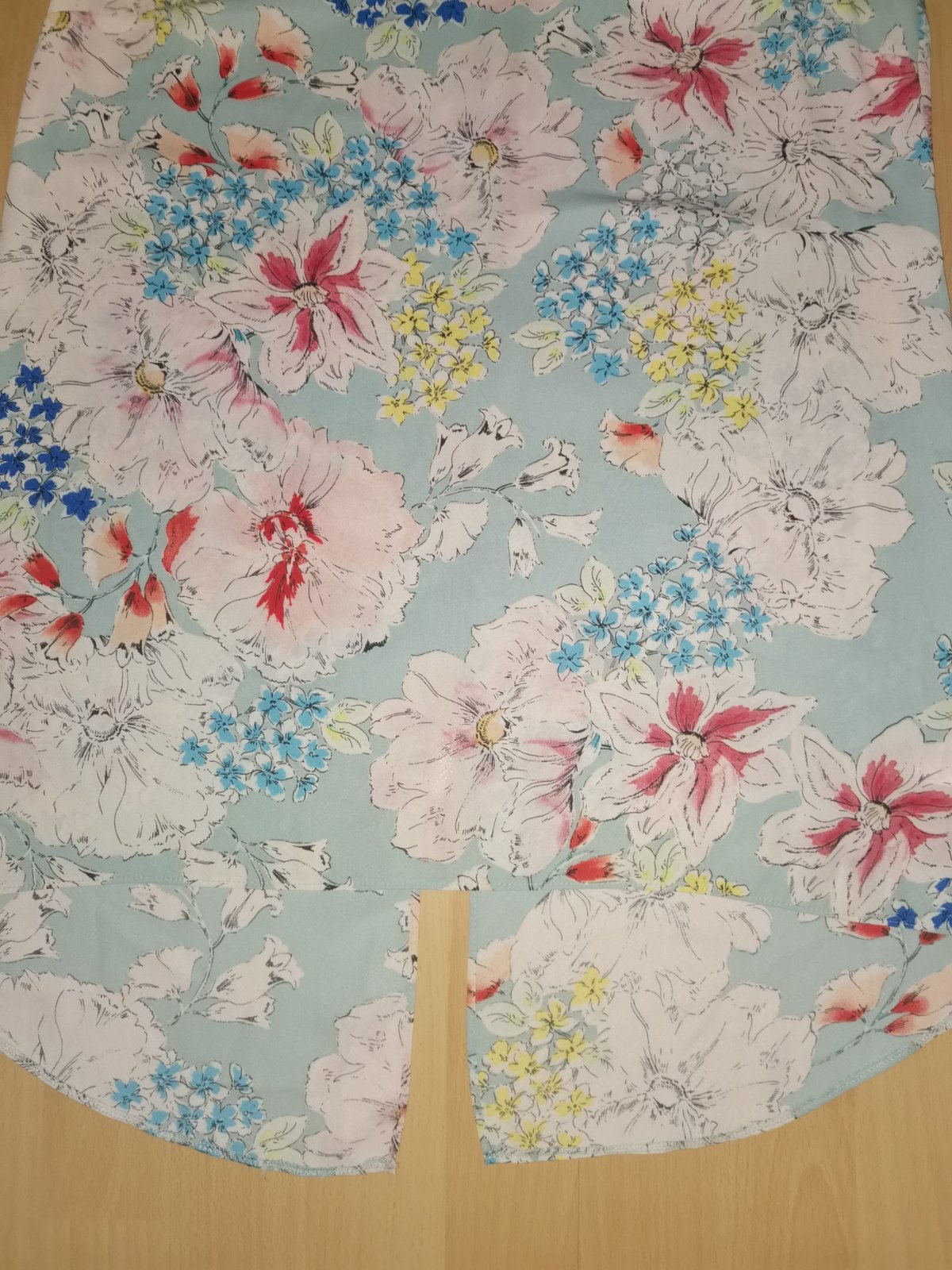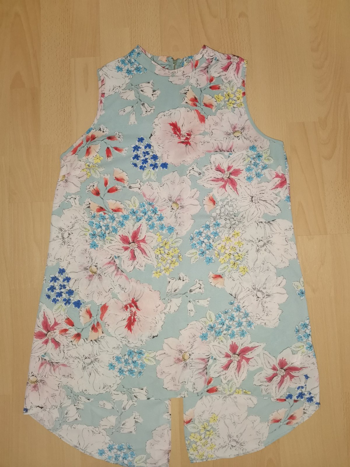274p. kvetovany predlzeny top, velk. 38/M, zn. Primark, atypycky tvar hore az pod krk zapinanie vzadu na zips spodok predlzeny a na spodu strihnuty, nijak neposkodeny, posuvame dalej, cez prsia 47x2cm, cez brucho 49x2cm, dlzka prednej casri 75cm, dlzka zadnej casti 82cm