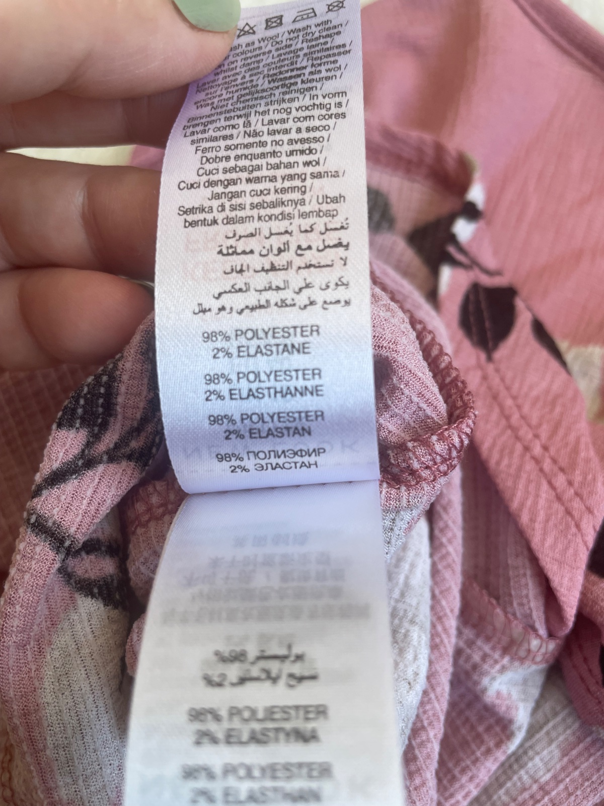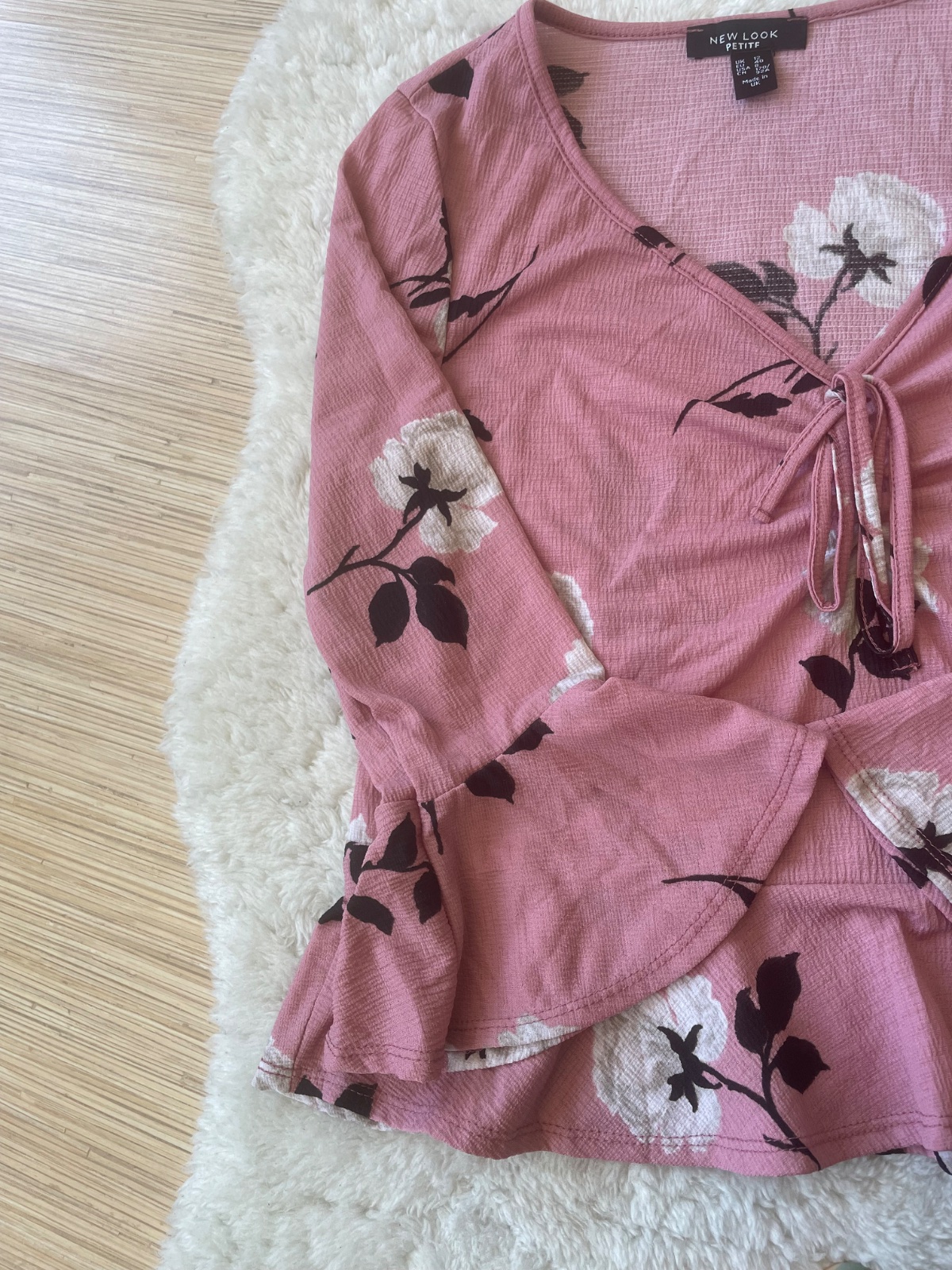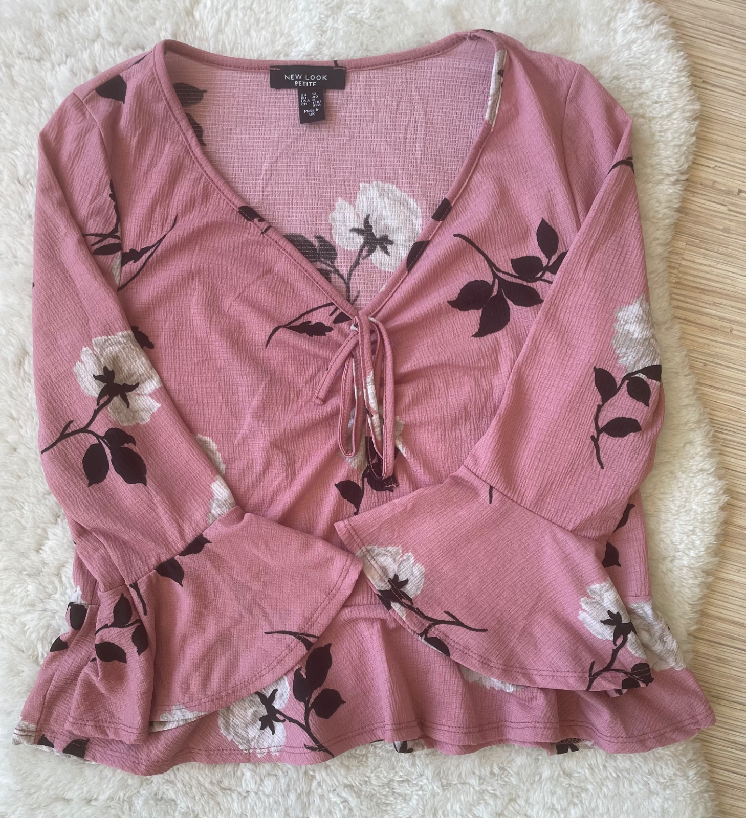 Ruzova bluzka s kvetmi s V vystrihom, na prsiach nariasena, maslicka na ozdobu. Rukavy a lem volanove. Natahovaci material.