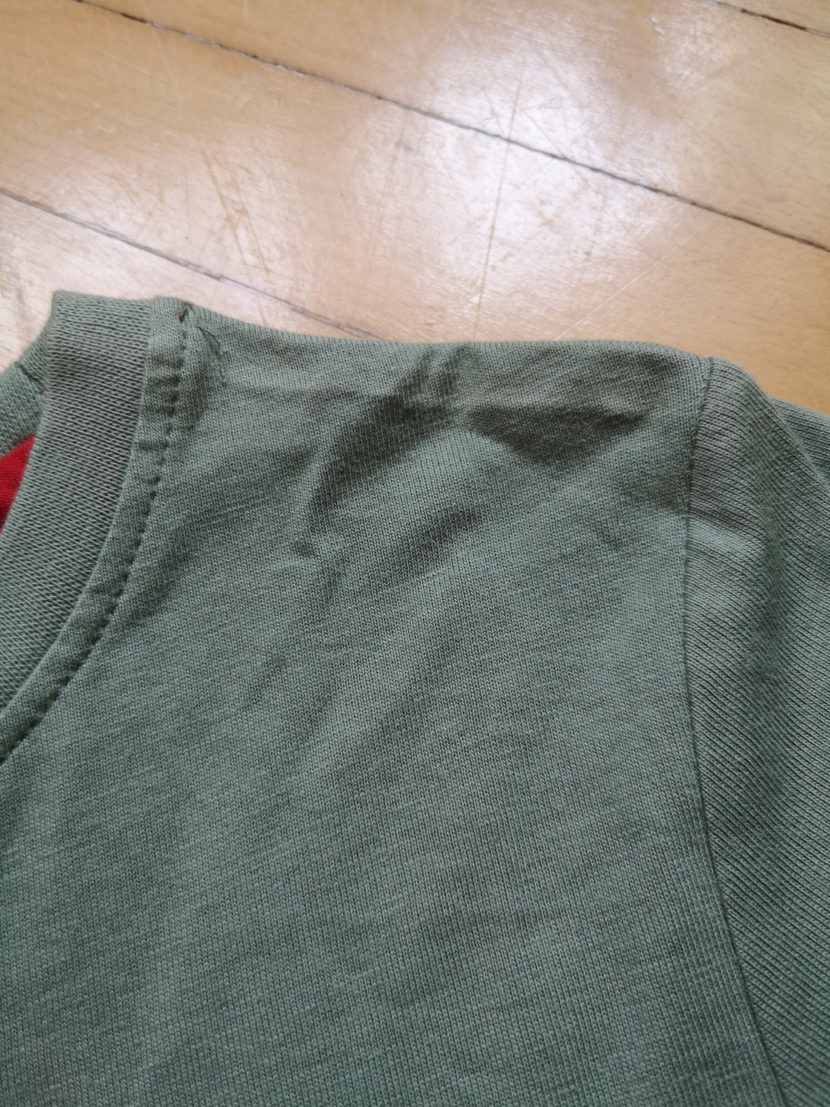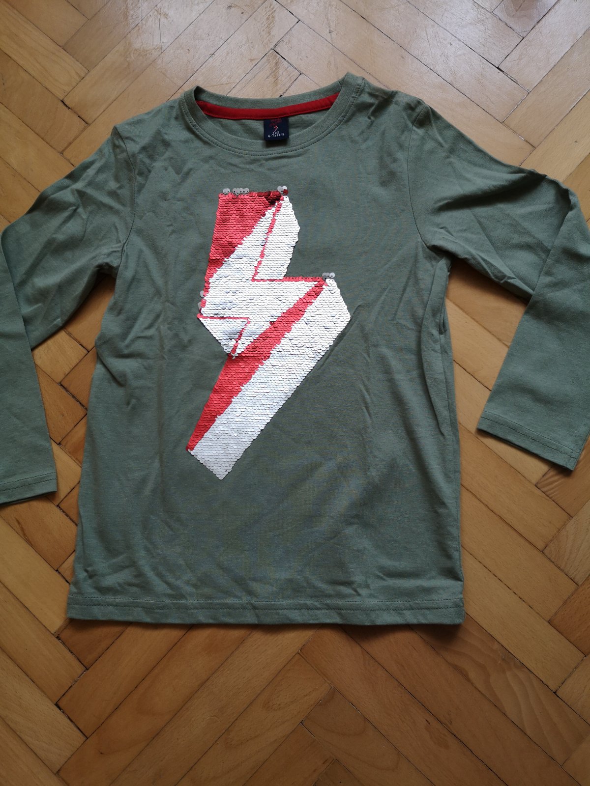 Nenosené tricko s visackou, s meniacimi flitrami na prednej casti, ja som kupila dcerke, ale zabudla som na to, a ked som nasla uz boli male, ale je vhodne aj pre chlapcov. Na prave strane na pleciach akoby bola farba trosicku vyblednuta, ale skoro vobec to nevidiet, asi je to z toho ze bolo vyvesene na stojane vonku.