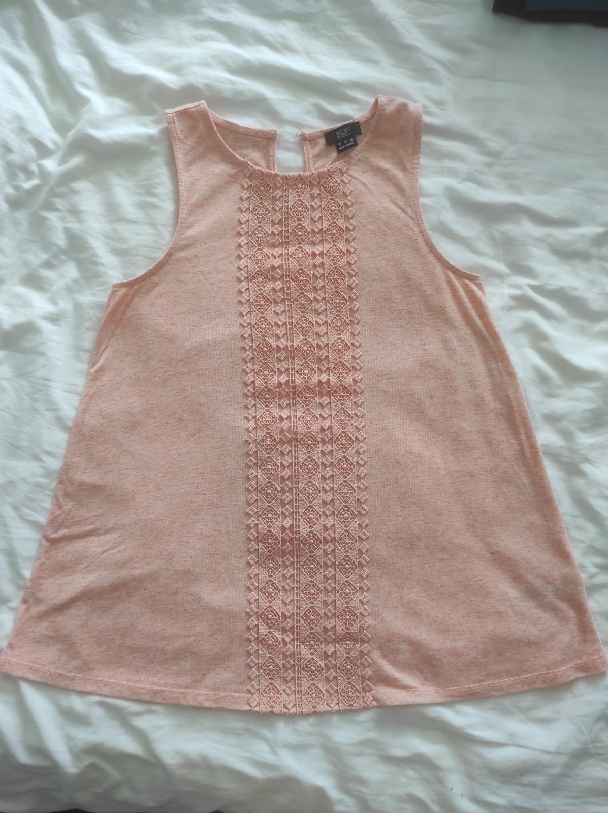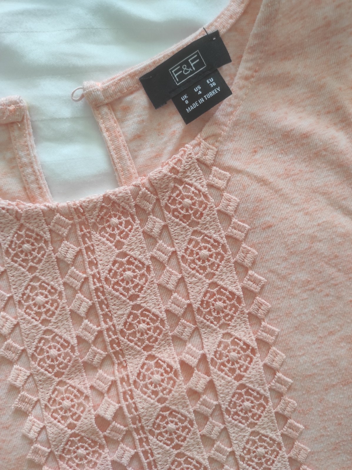 Predĺžene tielko lososovej farby. Efektná čipka. Dole rozšírené, v prípade potreby zakryje aj tehotenske bruško.