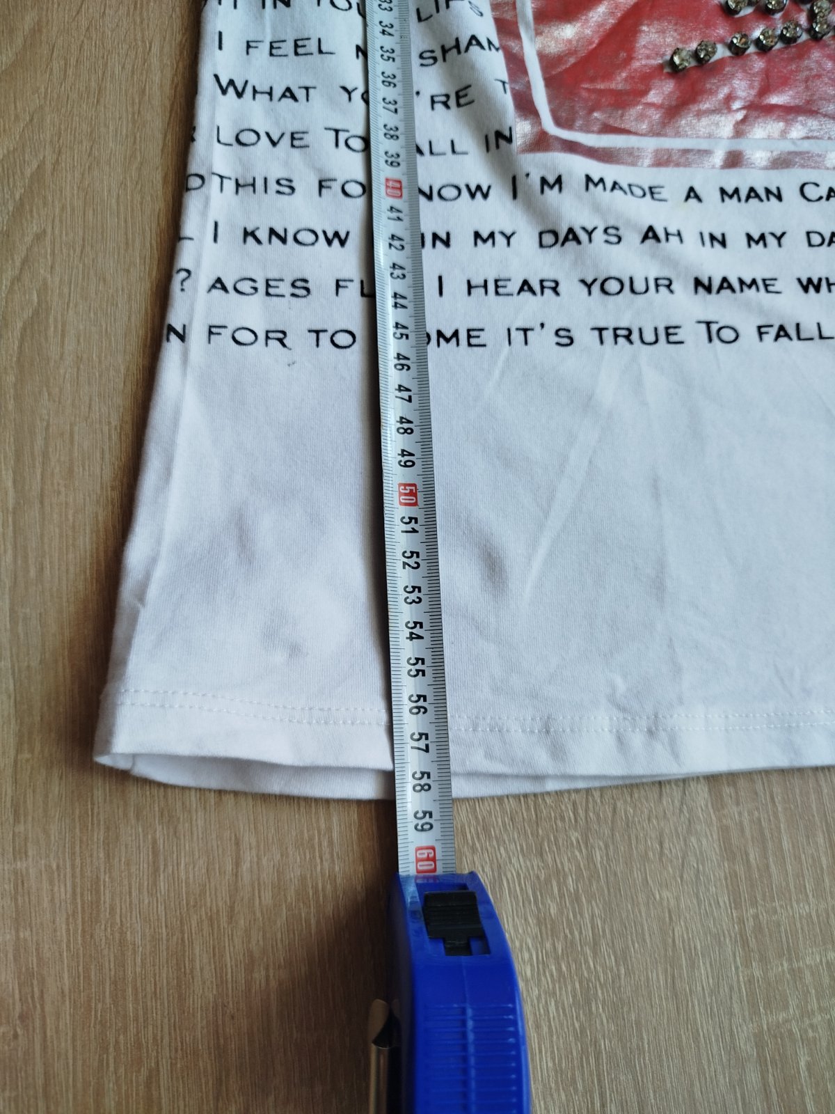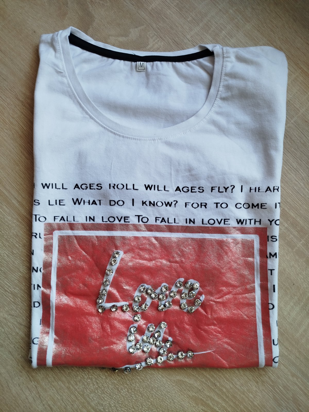 - veľmi pekne tričko, podľa mňa elasticka bavlna, rozmery pofotene, s peknymi kamienkami, nechýba ani jeden, posledná fotka - pri foteni nad písm.A som nasla malinky bledý fľak, stále pekne